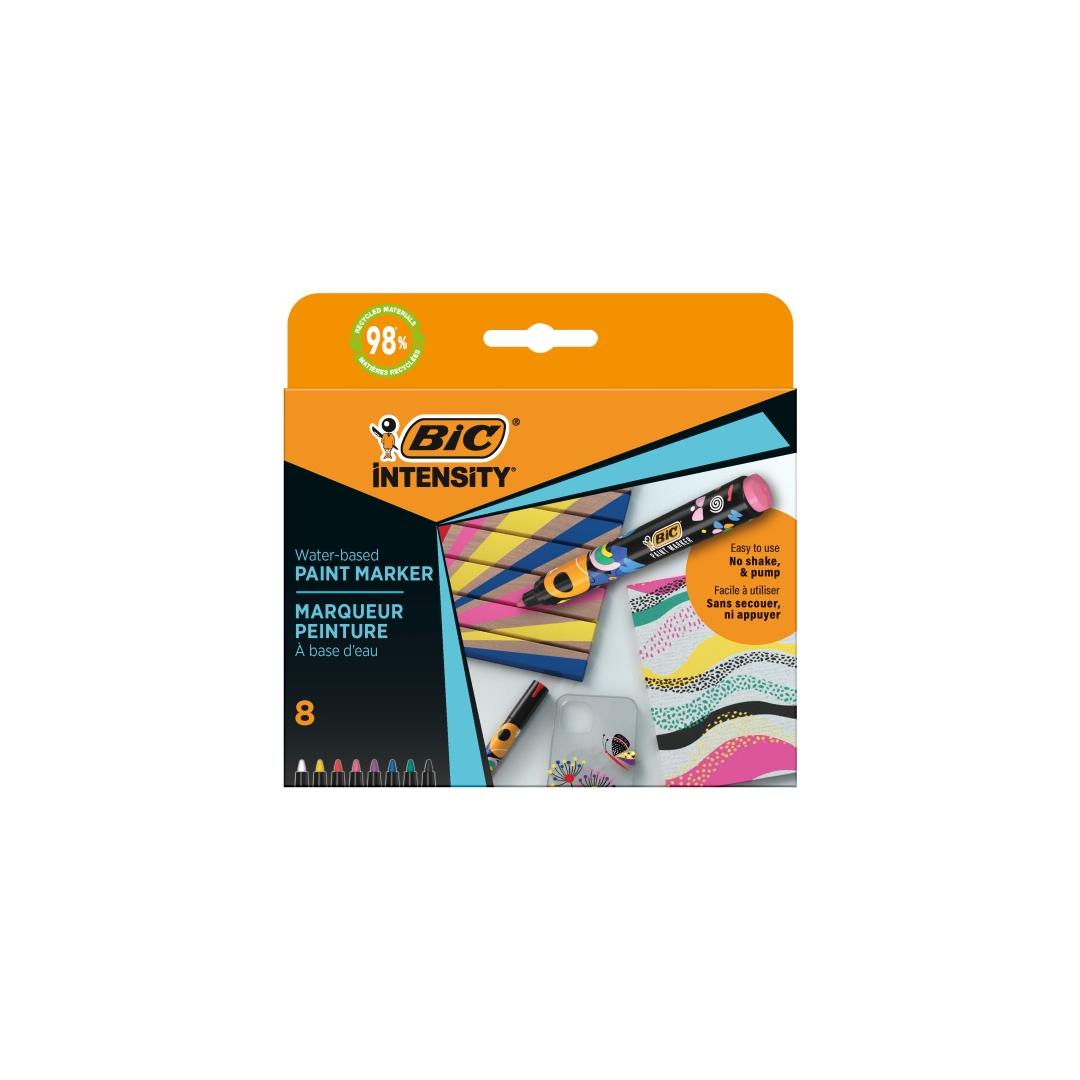 Letting your creative juices flow is so easy with BIC Intensity Paint Markers, no shaking or pumping needed. This box contains 8 vivid colours of non-toxic paint markers made of 98% recycled materials (excluding the ink system) with a medium bullet nib and water-based ink. They work indoors and outdoors, permanent on most porous surfaces (wood, cardboard, most fabrics, certain plastics, and canvas) even dark ones. The BIC quality you trust and value you expect.