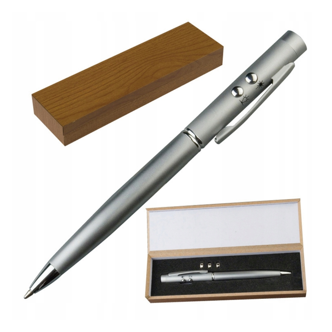 Ballpen with laser pointer and LED light, packed in an individual box; three button cell batteries included
