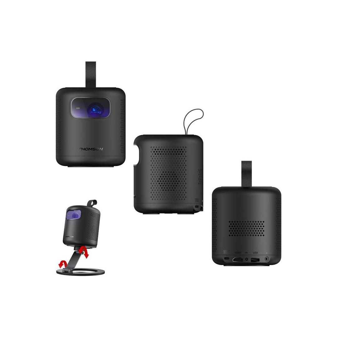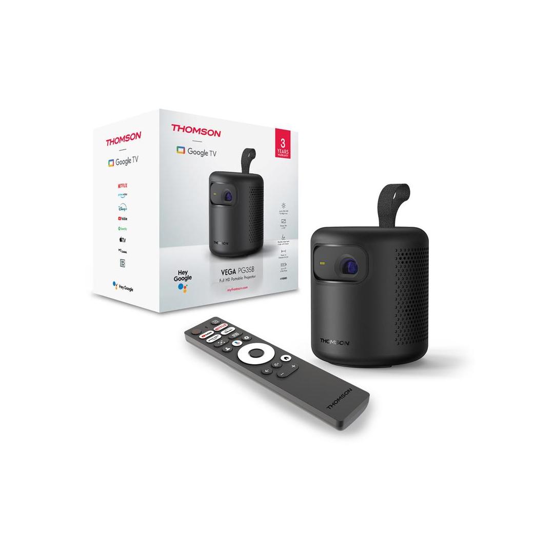 The Thomson Vega PG35B LED LCD portable gaming projector has 350 ANSI lumens, a contrast ratio of 350:1, and HDTV 1920 x 1080 resolution. It is an LED projector with a light life of 30,000 hours, which equates to over 20.5 years of enjoyment at four hours per day. An image width of up to 190 cm is possible. However, in room lighting, the image should be smaller. We recommend a maximum of 127 cm. The built-in 33.48 Wh battery means that no power supply is required, allowing the projector to be set up quickly and flexibly. Google TV turns the projector into a versatile media hub that can be seamlessly integrated into a smart home. The model recognizes Airplay and Miracast screen mirroring signals, making it possible to play high-resolution videos with surround sound directly via Wi-Fi from a smartphone, tablet, or PC (Android, Windows, and iOS). In addition, the Bluetooth capability is a useful addition to the projector, especially for wireless audio transmission. Even 1080P and 4K (compressed) video signals are no problem for the projector.
