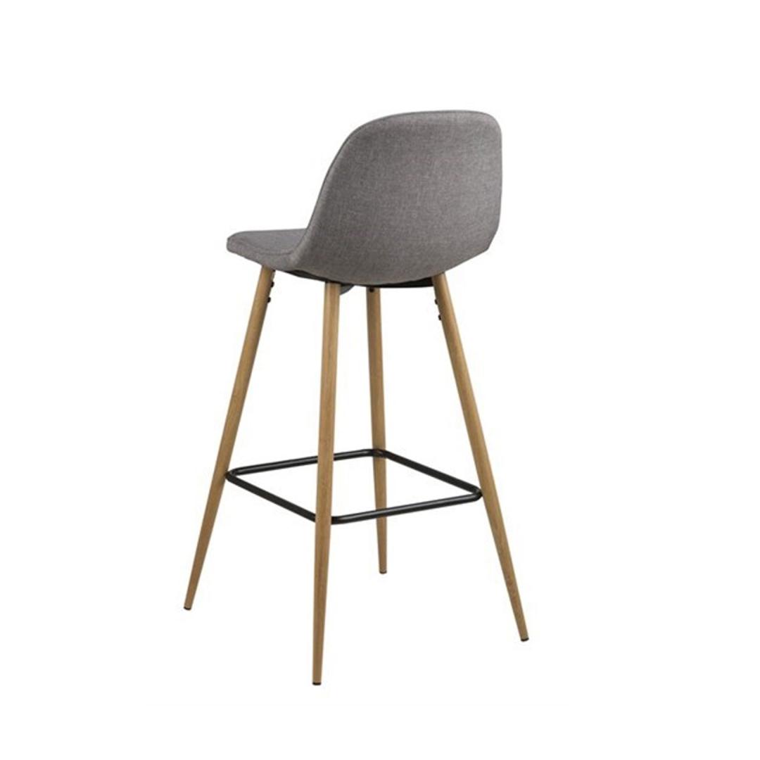 Bar stool WILMA 46,6x51xH101cm. The bar stool is perfect for a quick bite or coffee, while offering a contemporary style for your kitchen area. The upholstery and footrest make this chair suitable for a long dinner too. The seat and backrest: fabric, color: light grey, legs: metal, finish: oak look. Weight limit: 110kg.