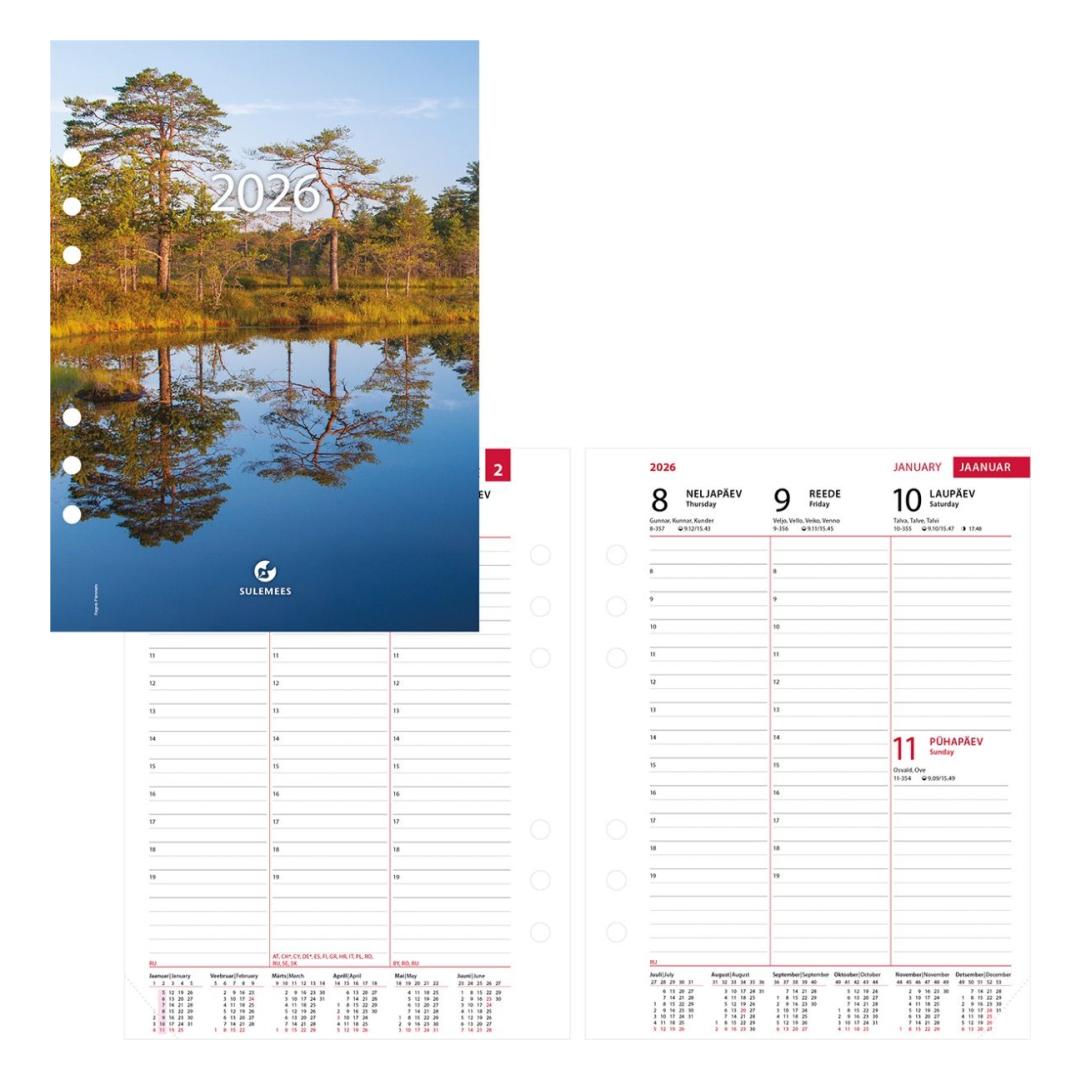 Weekly and vertical 6-hole calendar content for Manager-style covers. Hole distances from center to center 19-19-70-19-19 mm. Page. size 142x202mm. The calendar includes public holidays, national and national calendar anniversaries, flag days, name days, 42 national holidays as abbreviations, sunrise and sunset times, phases of the moon, beginning of seasons, plans for the current and next year, tabular calendars for the year, phonetic alphabets, unit conversion table and tables for most countries of the world about phone codes, currency, time difference, etc., 16 pages of Estonian map.