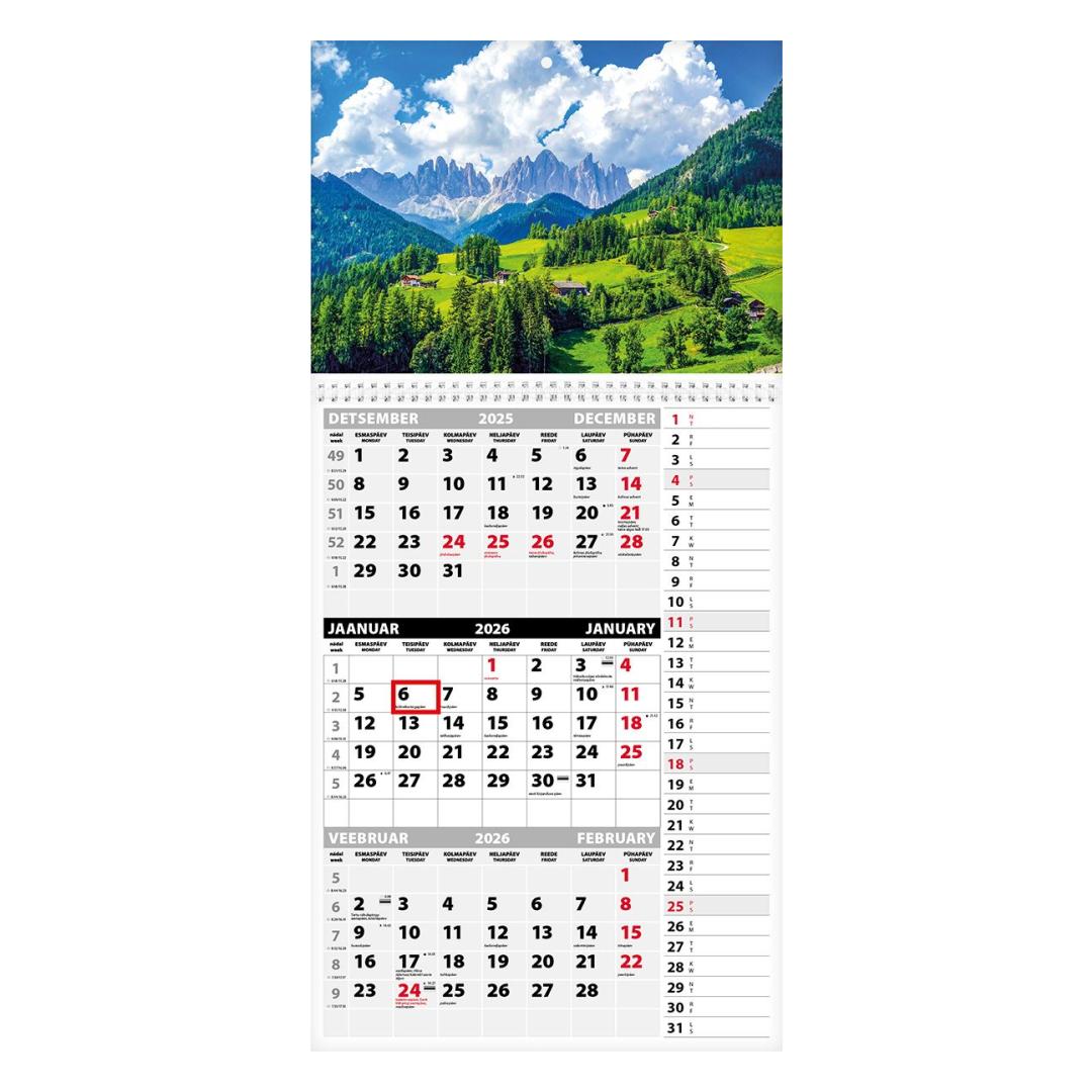 Wall calendar with three months view. Open size with picture 297x630mm. Red static date marker. The calendar includes national holidays, national and national calendar anniversaries, flag days, 42 national holidays as abbreviations, sunrise and sunset times, phases of the moon, beginnings of seasons. Day and month names in Estonian and English. On the right side of the page, day boxes for marking birthdays or events. When ordering with your own image and/or advertising strip, the price changes.