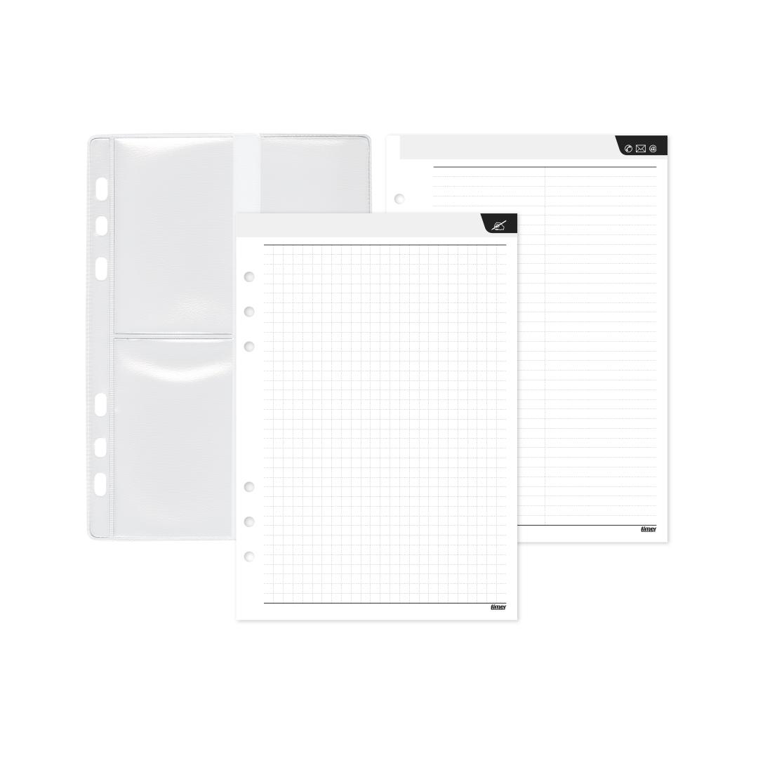 Telephone sheets 30 pcs. (perforated, 6 holes) Note sheets 30 pcs. (perforated, 6 holes) Business card pockets 5 pcs.