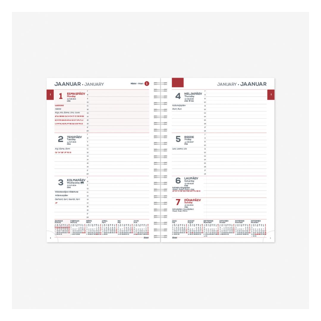 Content size: 145 x 210 mm (A5) Spiral binding Language: Estonian, English, Latvian, Lithuanian, Russian July 2021 - December 2022 Suitable for the following covers: MINISTER PVC Day MINISTER Spirex MINISTER Trend MINISTER Flex MINISTER Pattern MINISTER Embroidery MINISTER MINISTER Kört MINISTER Majestic MINISTER Exclusive MINISTER 18 MONTHS Flex UNIKA Spirex UNIKA Trend UNIKA Flex