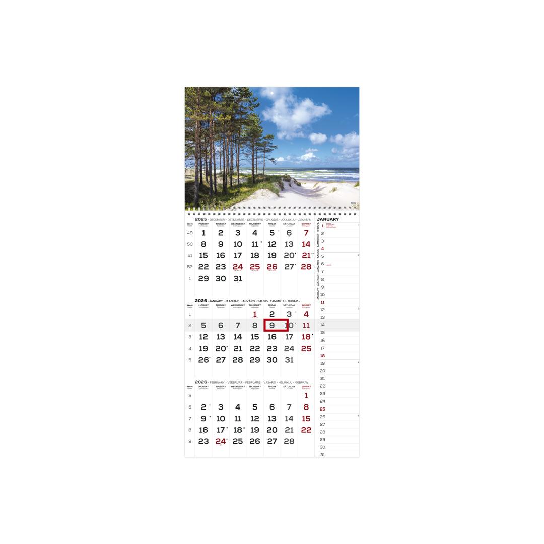 Size: 297 x 630 mm Spiral binding Hanging hole Content volume 12 pages Date marker Content dark gray / red Language: Estonian, English, Latvian, Lithuanian, Finnish, Russian The calendar includes the following: National holidays, national holidays of 4 countries with abbreviations (EST, LAT, LIT, FIN), moon phases, zodiac signs, previous and next month, week number.