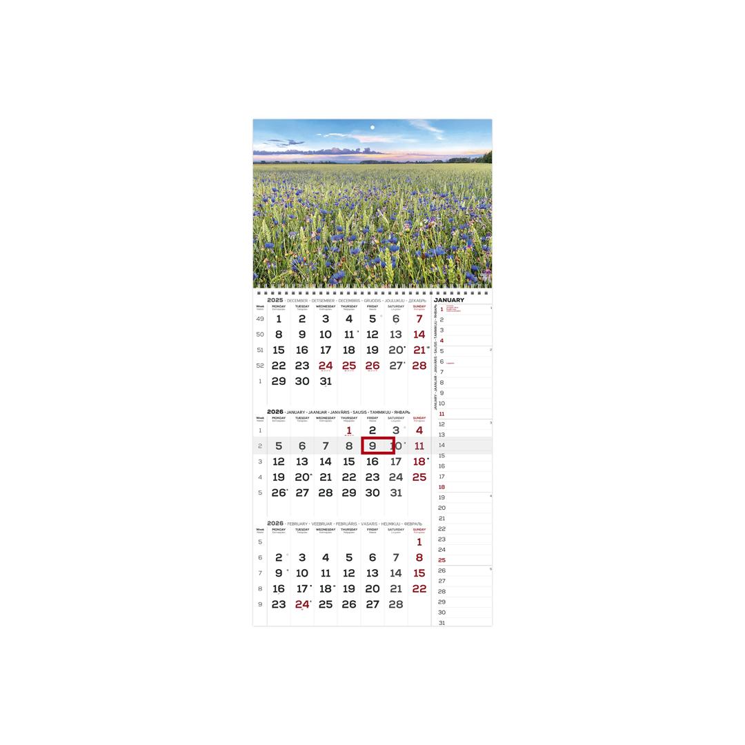 Size: 297 x 630 mm Spiral binding Hanging hole Content volume 12 pages Date marker Content dark gray / red Language: Estonian, English, Latvian, Lithuanian, Finnish, Russian The calendar includes the following: National holidays, national holidays of 4 countries with abbreviations (EST, LAT, LIT, FIN), moon phases, zodiac signs, previous and next month, week number.