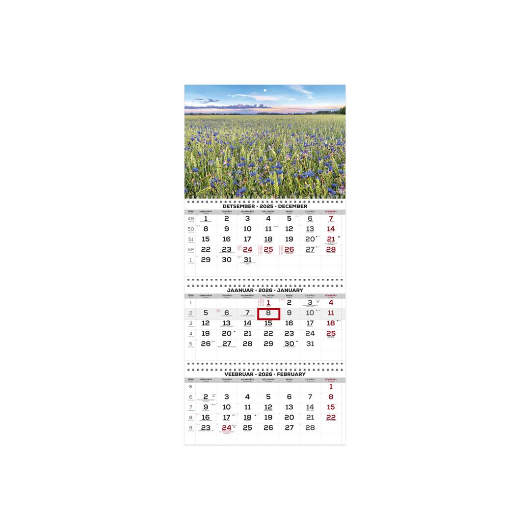 Size: 297 x 650 mm Three-part spiral binding Hanging hole Content volume 3 x 12 pages Date marker Content dark gray / red Language: Estonian and English The calendar includes the following: National holidays, national and national calendar anniversaries, flag days, national holidays of 37 countries with abbreviations, transition to summer and winter time, solar sunrise and sunset times (Tallinn), moon phases with times, zodiac signs, beginnings of seasons with times, previous and following month, week number.