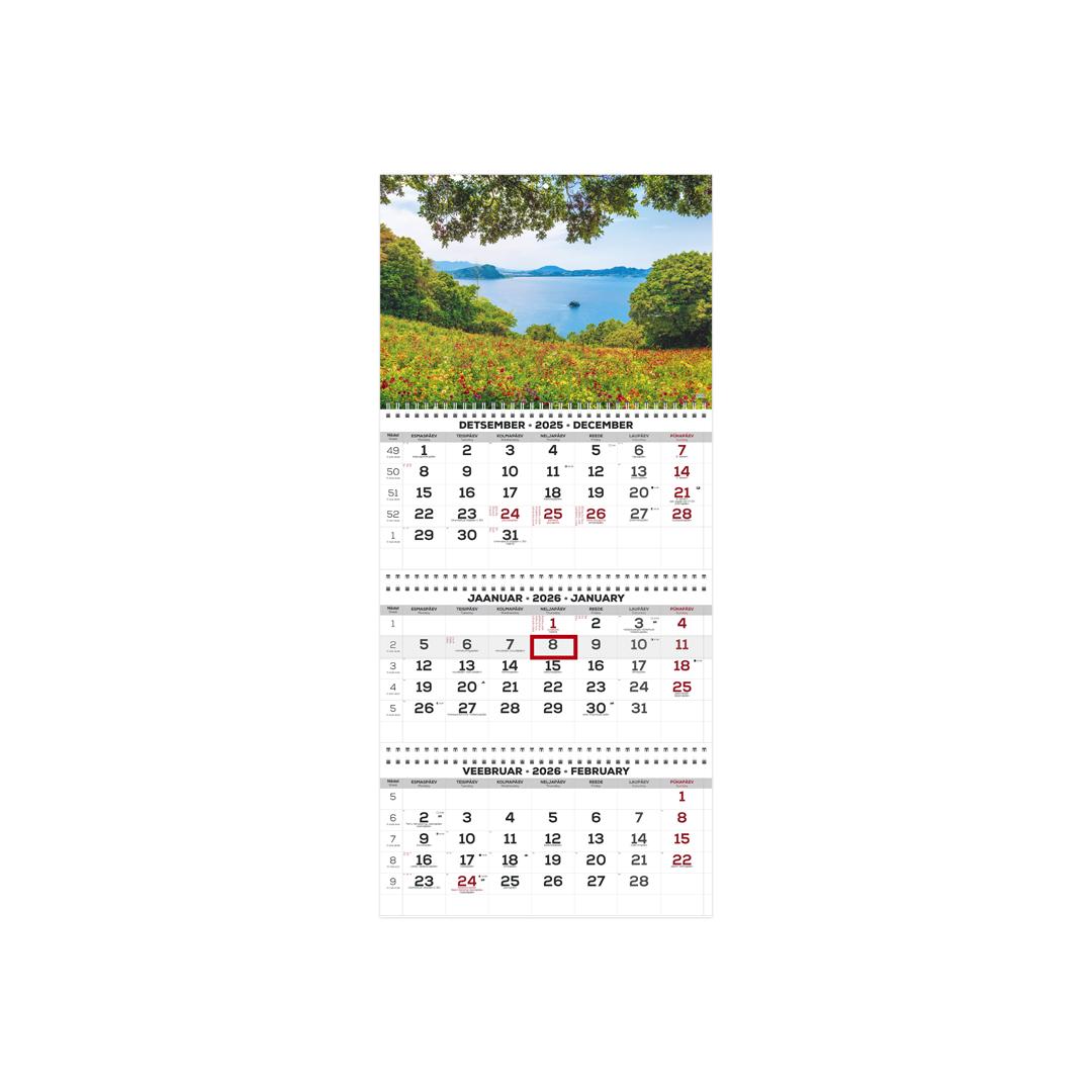 Size: 297 x 650 mm Three-part spiral binding Hanging hole Content volume 3 x 12 pages Date marker Content dark gray / red Language: Estonian and English The calendar includes the following: National holidays, national and national calendar anniversaries, flag days, national holidays of 37 countries with abbreviations, transition to summer and winter time, solar sunrise and sunset times (Tallinn), moon phases with times, zodiac signs, beginnings of seasons with times, previous and following month, week number.