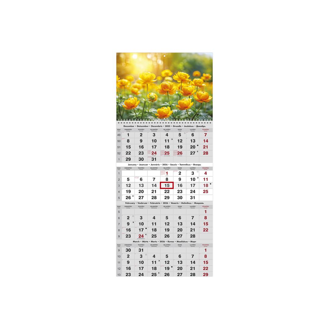 Size: 297 x 690 mm Spiral binding Hanging hole Content capacity 12 pages Date marker Content dark gray / red Language: Estonian, English, Latvian, Lithuanian, Finnish, Russian The calendar includes the following: National holidays, 37 national holidays with abbreviations, moon phases, week number, previous and 2 the following month.