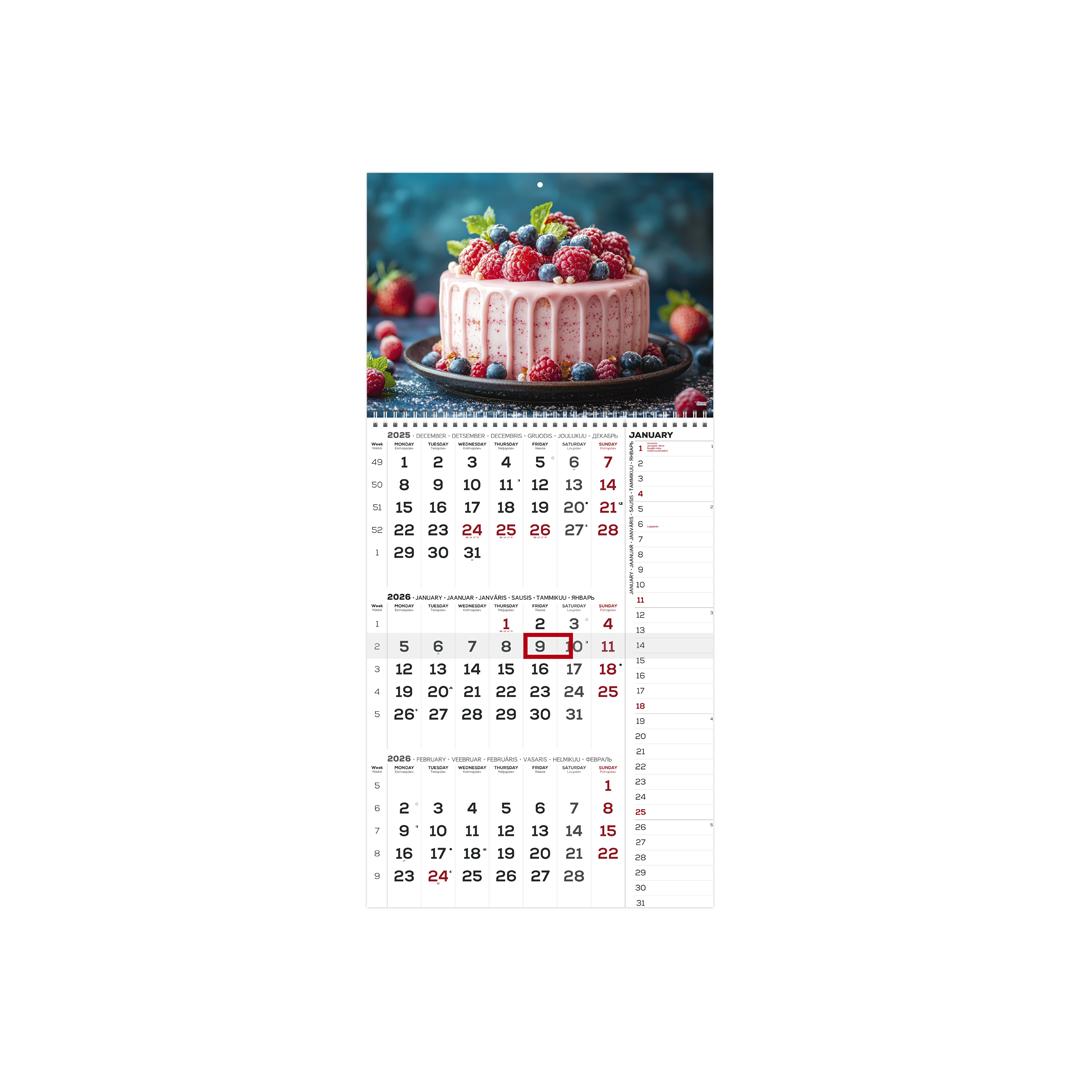 Size: 297 x 630 mm Spiral binding Hanging hole Content volume 12 pages Date marker Content dark gray / red Language: Estonian, English, Latvian, Lithuanian, Finnish, Russian The calendar includes the following: National holidays, national holidays of 4 countries with abbreviations (EST, LAT, LIT, FIN), moon phases, zodiac signs, previous and next month, week number.