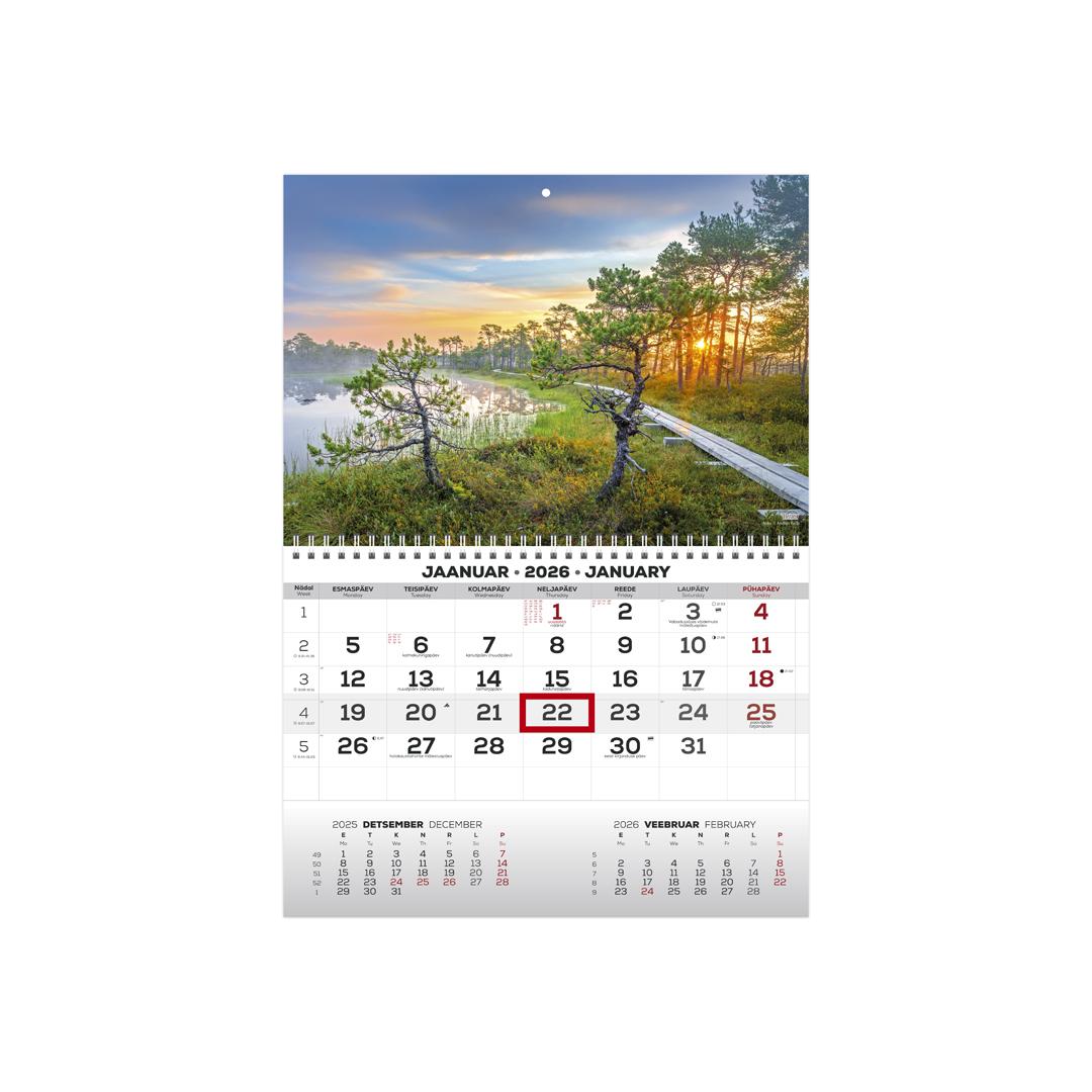 Size: 297 x 420 mm Spiral binding Hanging hole Content volume 12 pages Date marker Content dark gray / red Language: Estonian and English The calendar includes the following: National holidays, national and national calendar holidays, flag days, national holidays of 37 countries with abbreviations, summer and winter time transition, sunrise and sunset times (Tallinn), phases of the moon with times, zodiac signs, beginnings of seasons with times, previous and following month, week number.