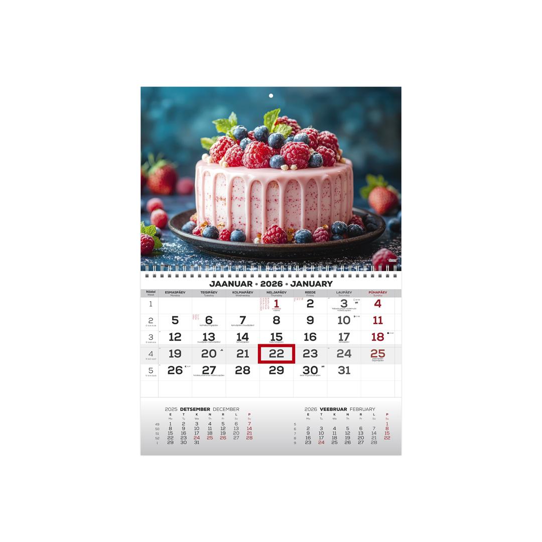 Size: 297 x 420 mm Spiral binding Hanging hole Content volume 12 pages Date marker Content dark gray / red Language: Estonian and English The calendar includes the following: National holidays, national and national calendar holidays, flag days, national holidays of 37 countries with abbreviations, summer and winter time transition, sunrise and sunset times (Tallinn), phases of the moon with times, zodiac signs, beginnings of seasons with times, previous and following month, week number.