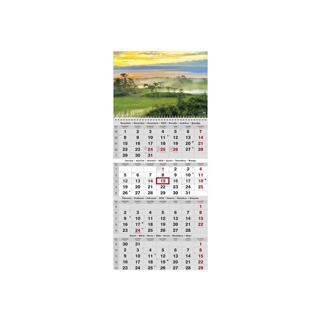 Size: 297 x 690 mm Spiral binding Hanging hole Content capacity 12 pages Date marker Content dark gray / red Language: Estonian, English, Latvian, Lithuanian, Finnish, Russian The calendar includes the following: National holidays, 37 national holidays with abbreviations, moon phases, week number, previous and 2 the following month.