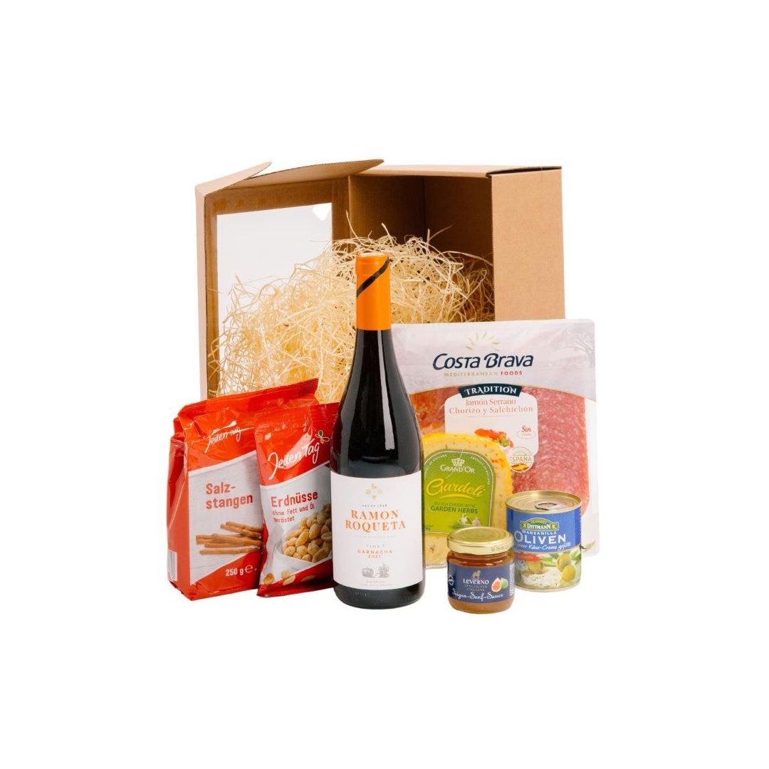 Удивите своих хороших коллег и деловых партнеров подарочной корзиной Торговца! ЗАКАЗ: при заказе более 50 штук срок упаковки 2-5 дней. Для заказа добавьте желаемое количество в корзину и напишите желаемое время доставки в комментариях при подтверждении заказа. Мы свяжемся с вами для уточнения заказа! В УПАКОВКЕ СКРЫТЫ: Оливки зеленые DITTMANN с кремом из голубого сыра 200г; LEVERNO Соус инжирно-горчичный 90мл; GRAND´OR Gardel Голландский сыр с зеленью 200г; КОСТА БРАВА Тапас Микс Серрано+Чоризо+Сальчичон 120г (ломтик); JEDEN TAG Арахис жареный 150г (специи); JEDEN TAG Солевые палочки 250г; РАМОН РОКЕТА Гарнача Тинта 14% 75 кл (красное, сухое).