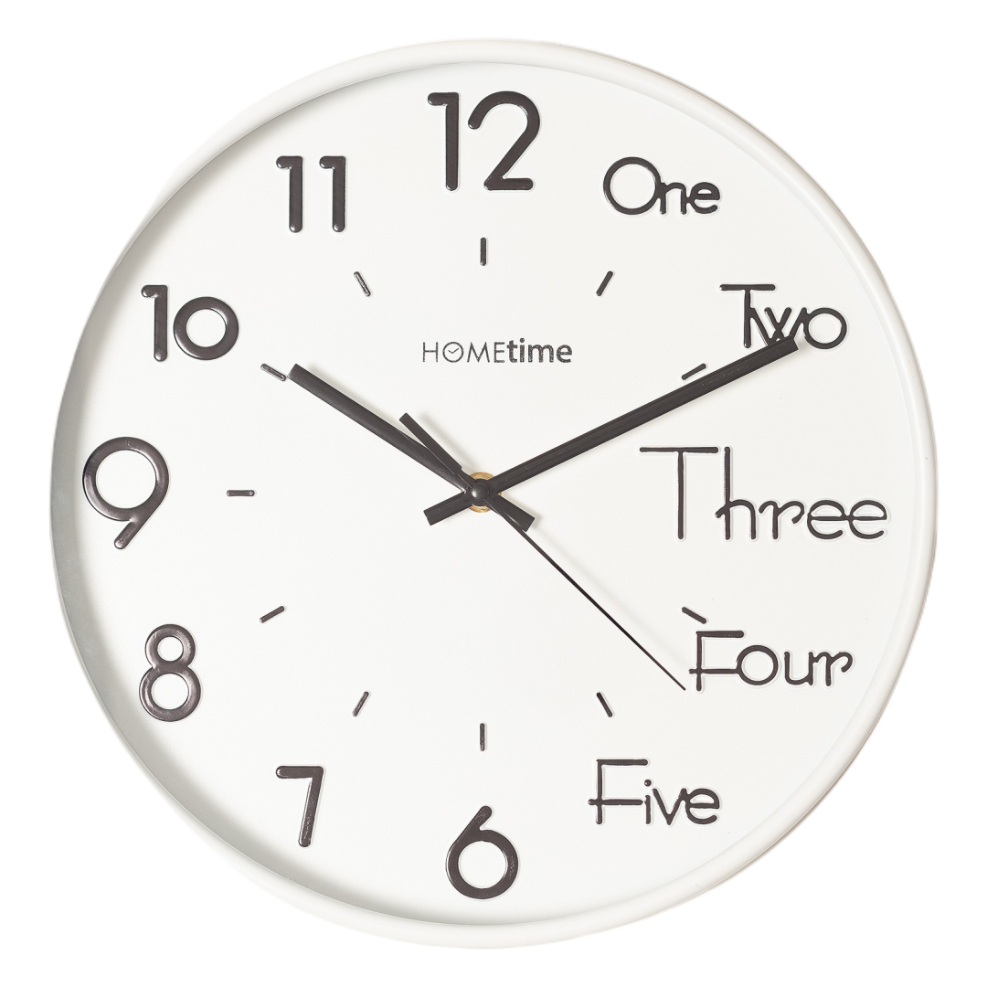 Настенные часы 30 см, частично с арабскими цифрами, частично с текстом Раз, Два, Три, Четыре, Пять...