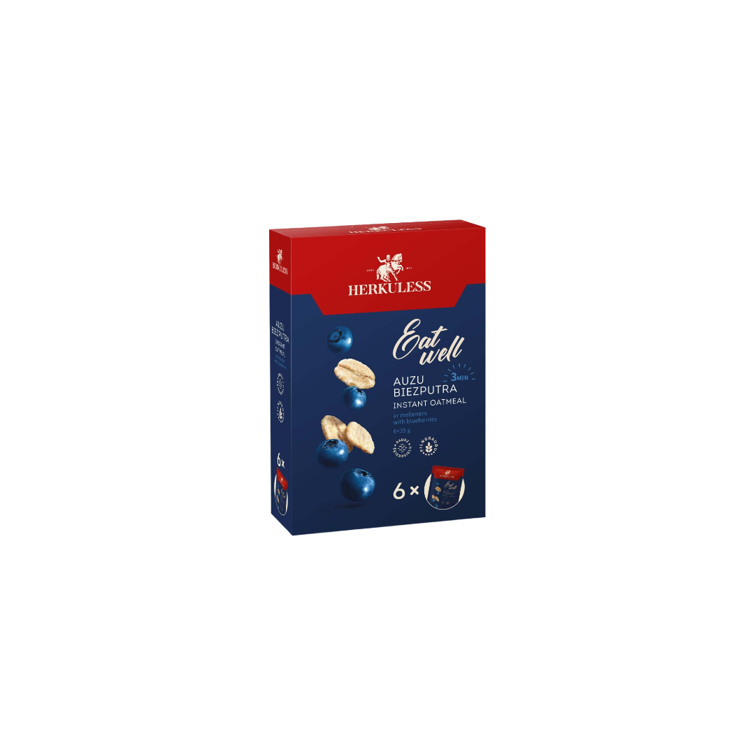 Овсянка 84%, сахар, сушеные кусочки черники 6%, соль, ароматизатор, масло подсолнечное. Может содержать частицы молока и сои. Приготовление: содержимое пакета высыпать в миску и залить 100 мл кипятка так, чтобы хлопья были покрыты. Тщательно перемешайте и оставьте под крышкой на 1 минуту.