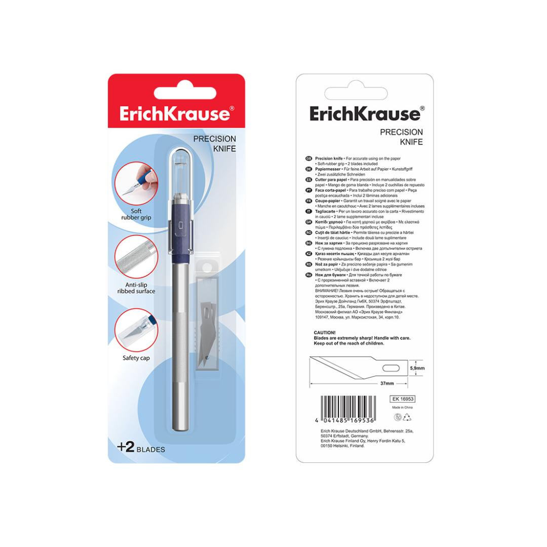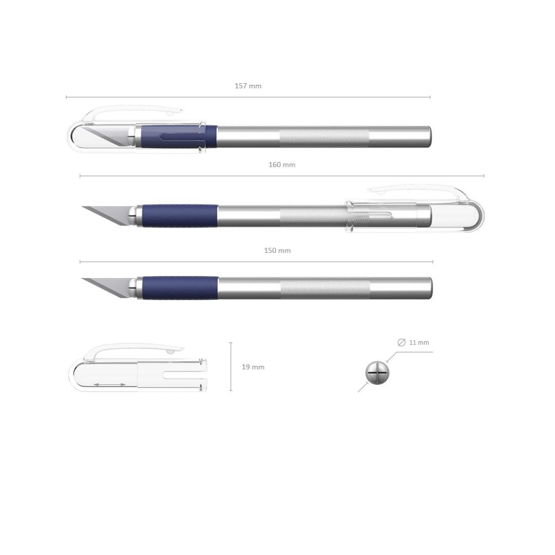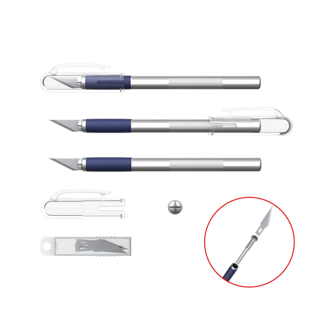 Прецизионные ножи (скальпель) для аккуратного и точного надреза бумаги. Цельнометаллический корпус с резиновой зоной захвата и защитным колпачком. Поставляется с обоюдоострым лезвием из износостойкой стали. Сопротивление ржавчине. В комплекте два запасных лезвия.