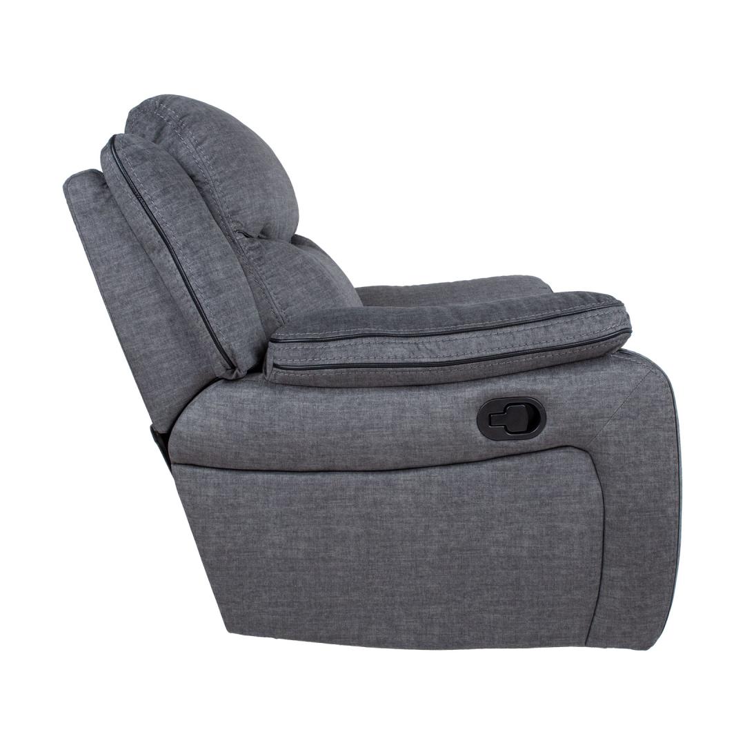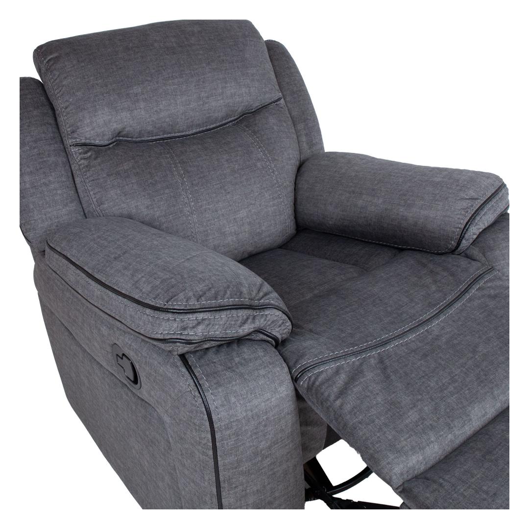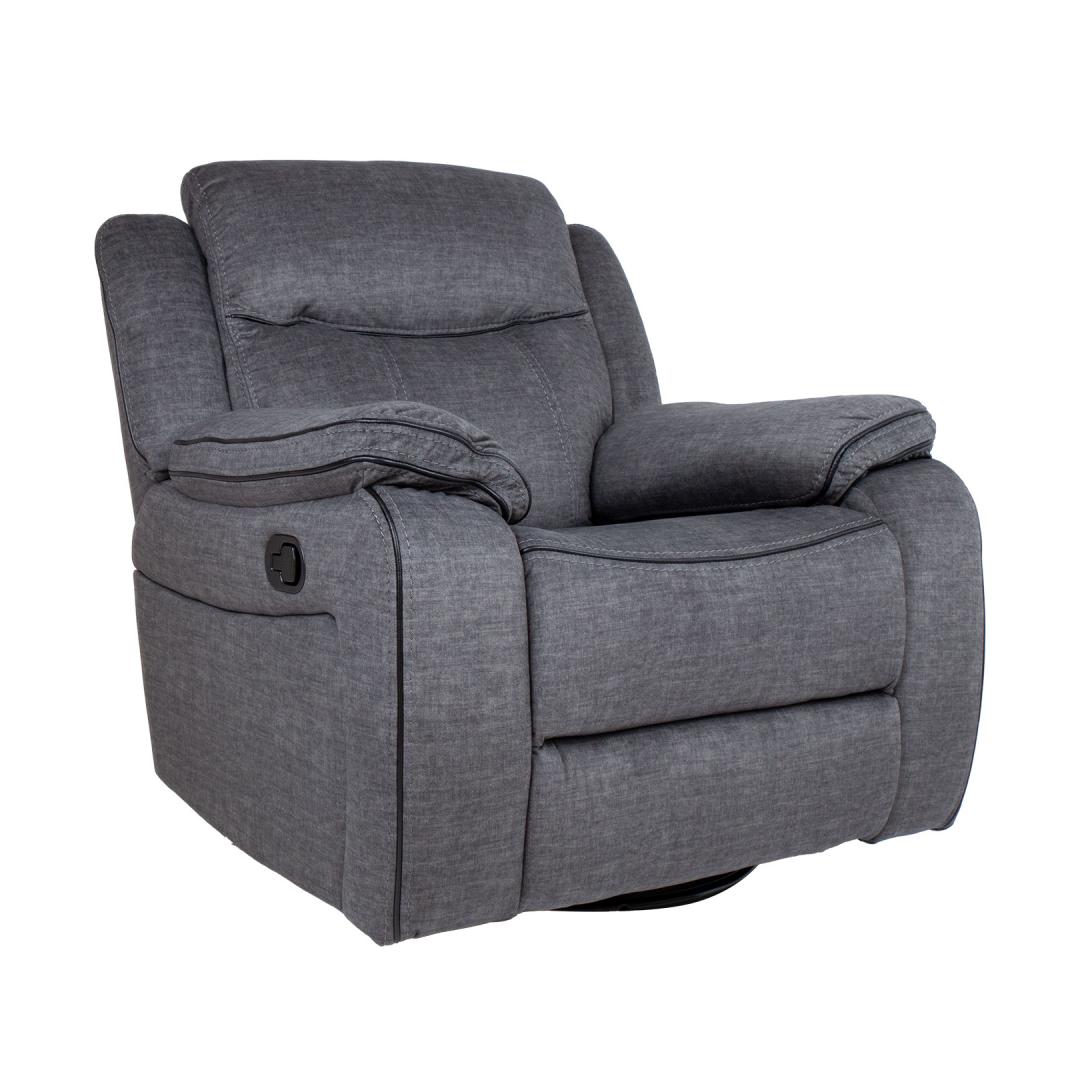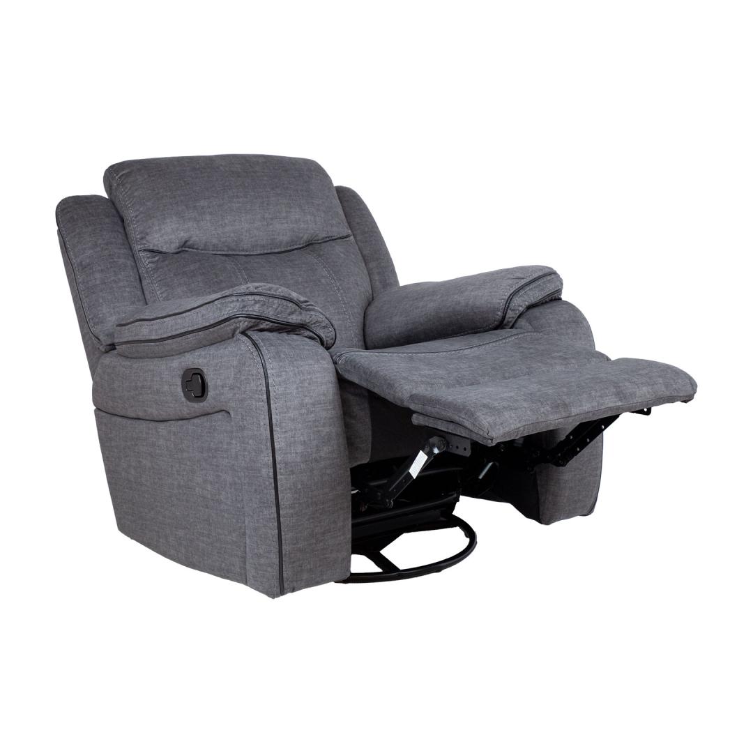 Кресло GENTRY качающееся и вращающееся с ручным креслом, серое. Изменить положение подножки кресла реклайнерного типа можно с помощью ручного механизма. Когда вы поднимаете подставку для ног, спинка плавно перемещается. Чтобы поднять подставку для ног, потяните вверх рычаг, расположенный справа снаружи кресла. Когда вы опускаете подножку вниз, она автоматически фиксируется в исходном положении. Кресло-качалка вращается на 360°. Материал чехла: ткань 100% полиэстер, декоративная окантовка из искусственной кожи черного цвета между швами. Каркас и подвес: фанера, дерево, металл. Обивка: пенополиуретан 24-30кг/м³. Габаритные размеры кресла 96x98xH102см. Ширина сиденья 56см, глубина сиденья 55см, высота сиденья 52см. Высота подлокотника от земли 66 см, ширина подлокотника 26 см. Tugitool GENTRY kiikuv ja pöörlev manuaalne recliner, hall. Recliner tüüpi tugitooli jalatoe asendit on võimalik muuta manuaalse mehhanismi abil. Jalatuge üles tõstes liigub seljatugi sujuvalt kaasa. Jalatoe tõstmiseks tõmmake tooli paremal välisküljel asuv kang üles. Surudes jalatuge alla fikseerub see automaatselt algasendisse. Kiikuv tugitool pöörleb 360º. Kattematerjal: 100% polüesterkangas, mustad kunstnahast dekoratiivsed kandid õmbluste vahel. Karkass ja vedrustus: vineer, puit, metall. Polsterdus: polüuretaanvaht 24-30kg/m³. Tugitooli üldmõõdud on 96x98xH102cm. Istme laius 56cm, istme sügavus 55cm, istme kõrgus 52cm. Käetoe kõrgus maast 66cm, käetoe laius 26cm.