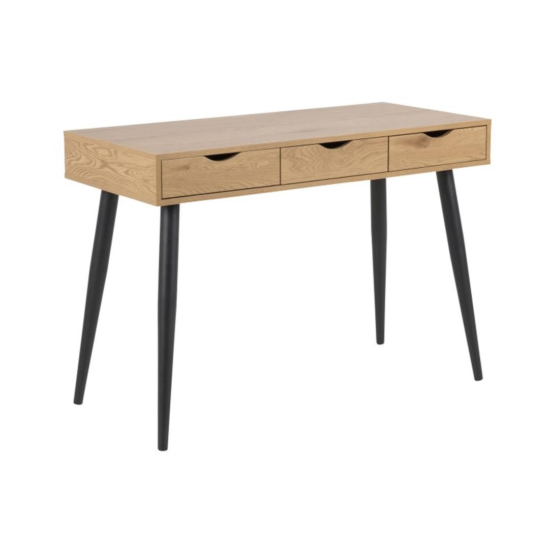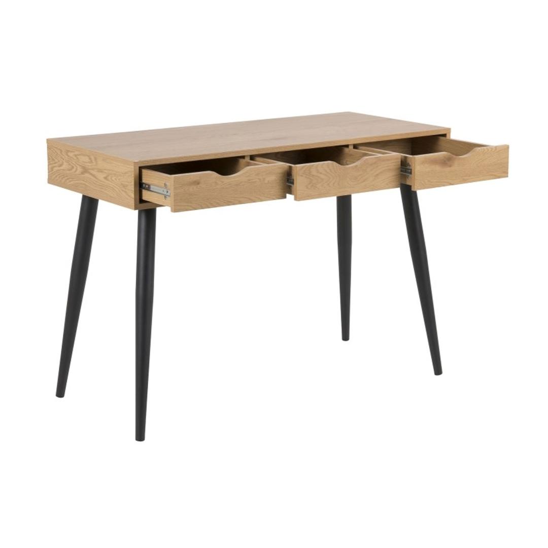 Письменный стол НЕПТУН 110x50xH77см, дуб. Стол — необходимое дополнение к каждому дому, позволяющее вам более комфортно пользоваться компьютером или создать для себя практичное домашнее офисное пространство. Столы древесных тонов идеально подходят для использования в домашней обстановке, поскольку теплый материал и мягкие цвета хорошо сочетаются с различной мебелью. Стол имеет три выдвижных ящика на металлических направляющих. Стол изготовлен из меламиновой плиты. Цвет дуб. Ножки изготовлены из черного металла. Размеры изделия 110x50xH77см. Письменный стол NEPTUN 110x50xH77см, дуб. Письменный стол - необходимое дополнение к любому дому, позволяющее удобнее использовать компьютер или создать практичное пространство домашнего офиса. Столы под дерево идеально подходят для домашнего интерьера, так как теплый материал и мягкие тона хорошо сочетаются с различной мебелью. У письменного стола три ящика. Письменный стол изготовлен из меламина. Цвет дубовый. Основание металлическое и окрашено в черный цвет. Размеры изделия 110x50xH77см.