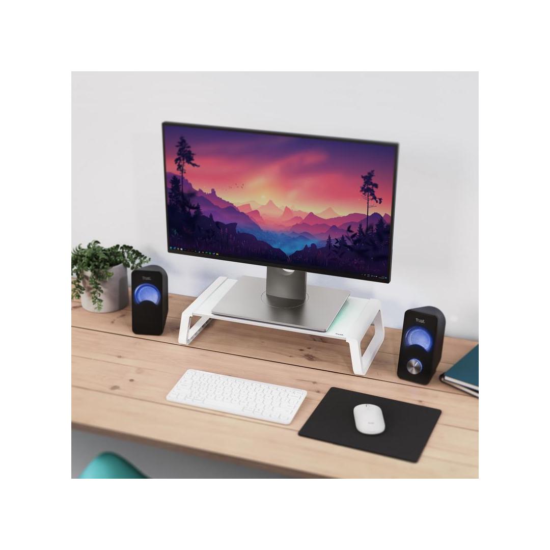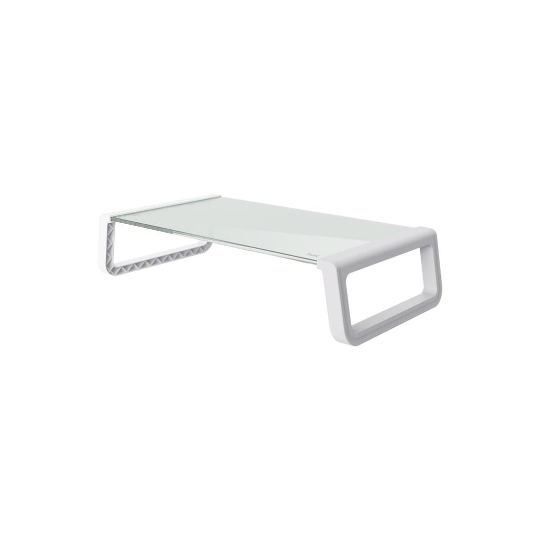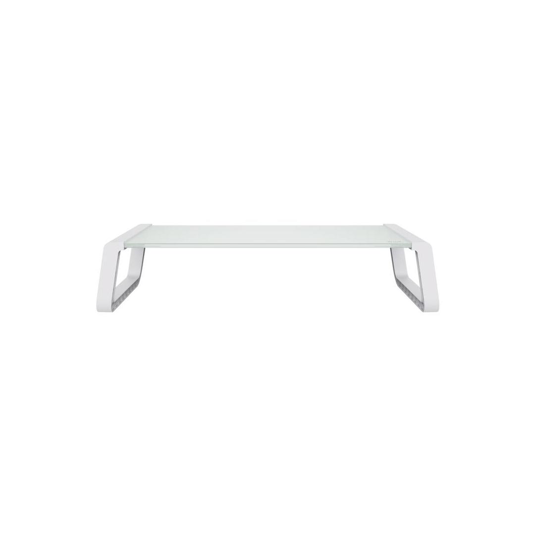 Tempered glass monitor stand for an ergonomic working position and organised desk.
