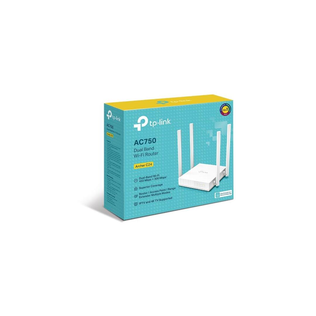 Archer C24|Available bandwidth 750 Mbps|Data transmission speed 433 Mbps|1 WAN|4x10/100M|Antenna Type Omni-Directional|Number of antennas 4|Included Accessories Power Adapter, RJ45 Ethernet Cable|Dimensions 115 × 106.7 × 24.3 mm