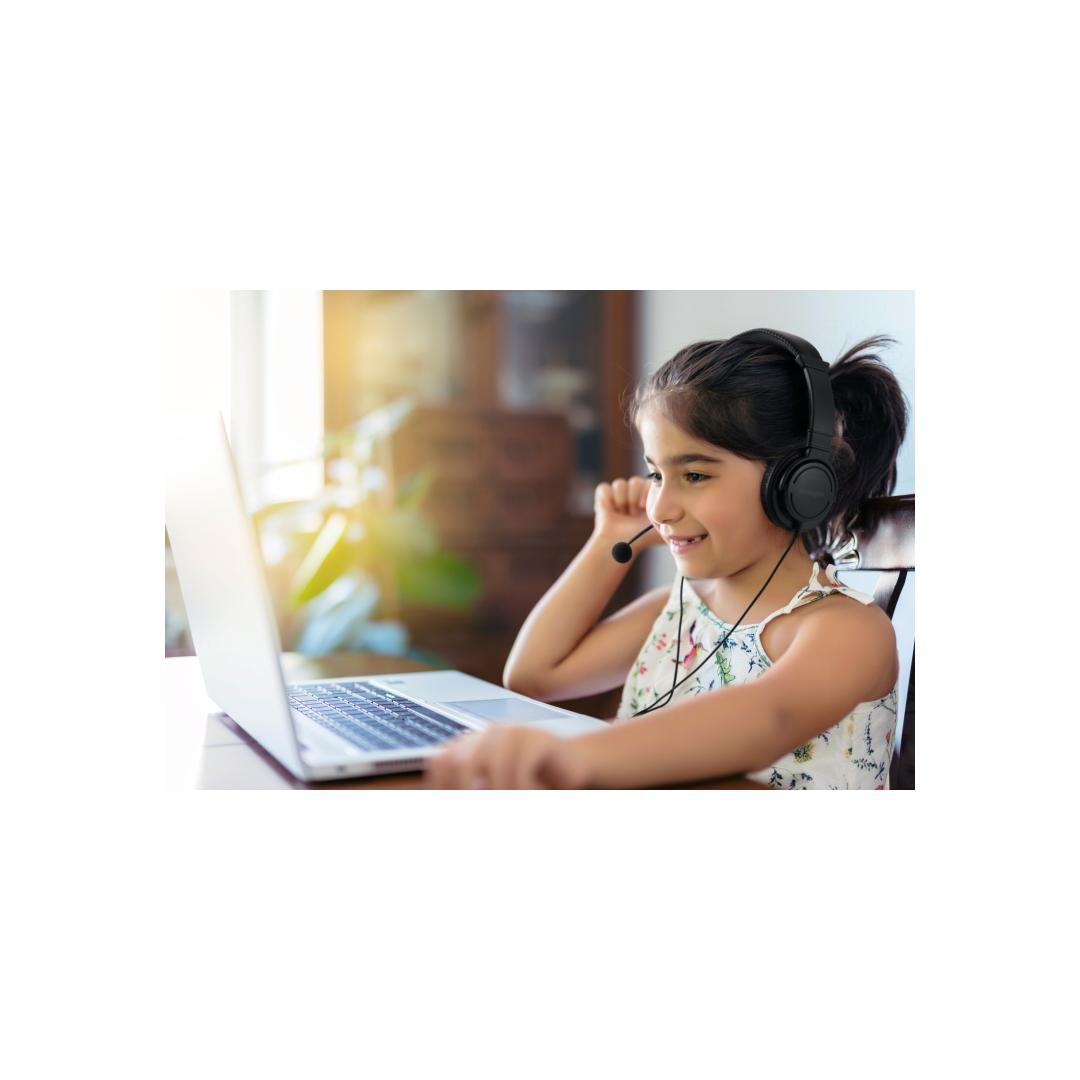Designed to fit heads of all ages, the adjustable headband is padded and the foam ear pads are wrapped in a soft leatherette cover to provide hours of comfortable use. The flexible boom-style microphone can be rotated up to 270 degrees. Robust design with durable materials, including a six-foot cord that allows for flexible movement make this headset ideal for learning environments, call centers, business professionals, and recreational gamers.