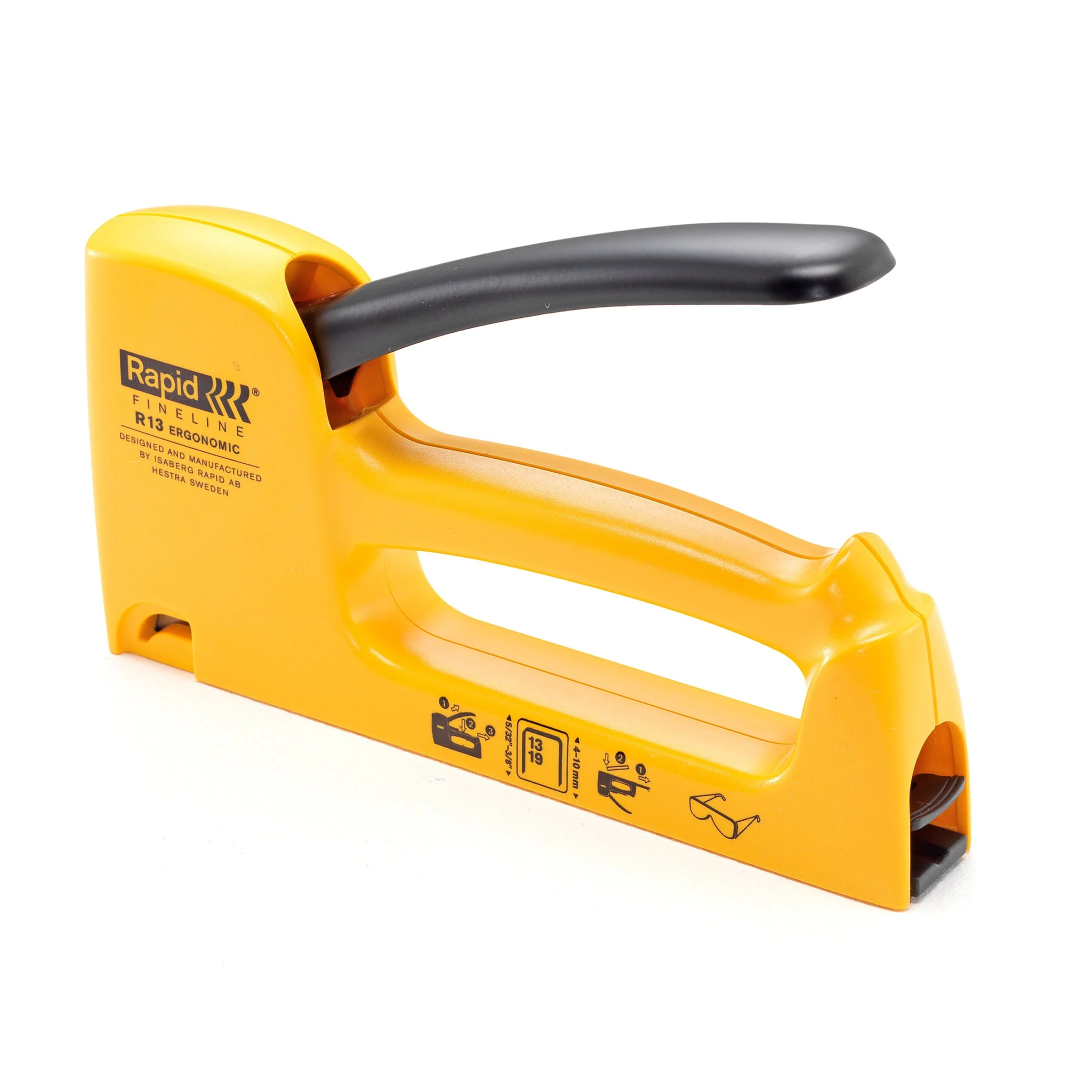 • Степлер для текстиля и тонких материалов. • Используются скобы № 13/4 и 13/8 • Степлер R13 эргономичен и удобен для домашнего использования. • Подходящие зажимы с маркировкой 13 (4-10 мм). • Продукт имеет систему блокировки, быструю загрузку.