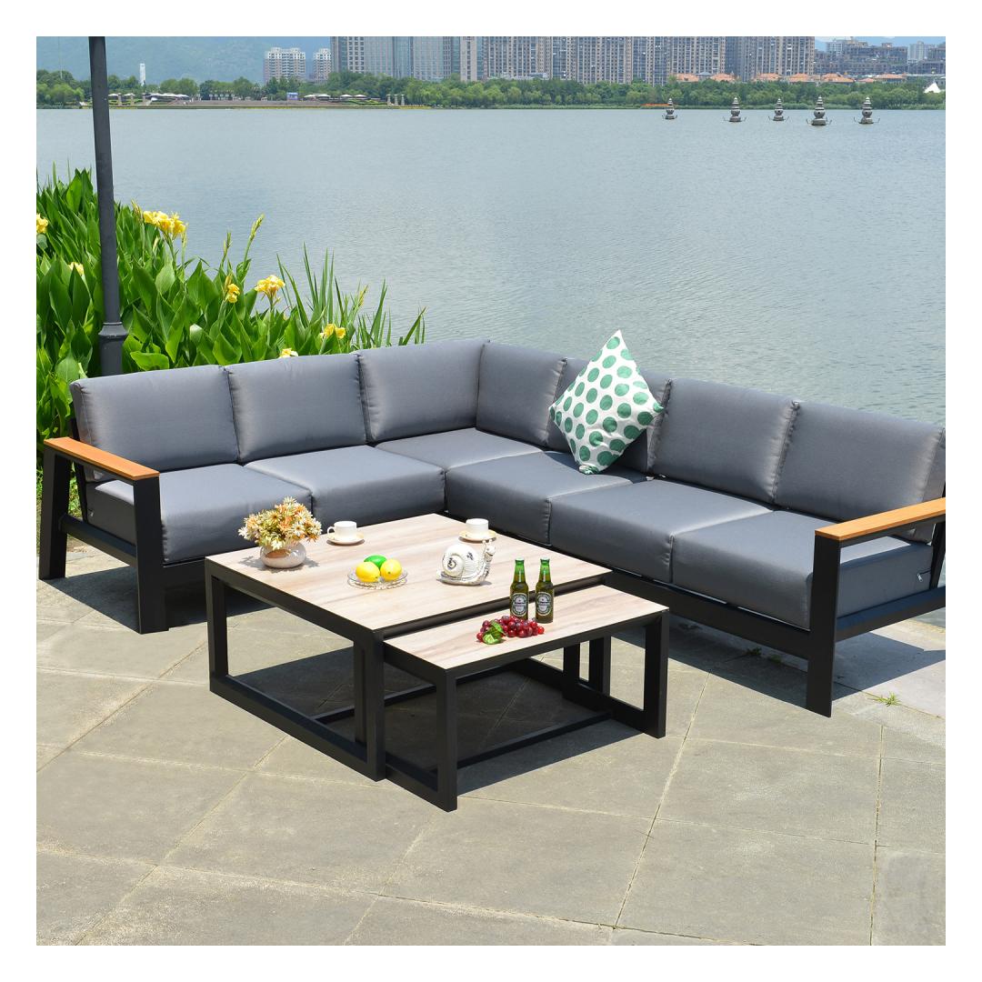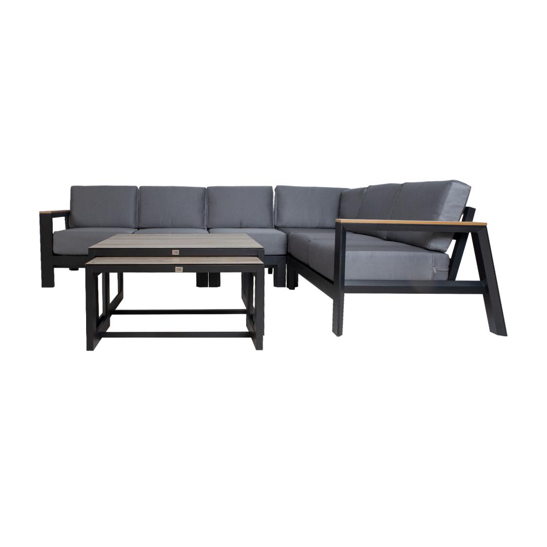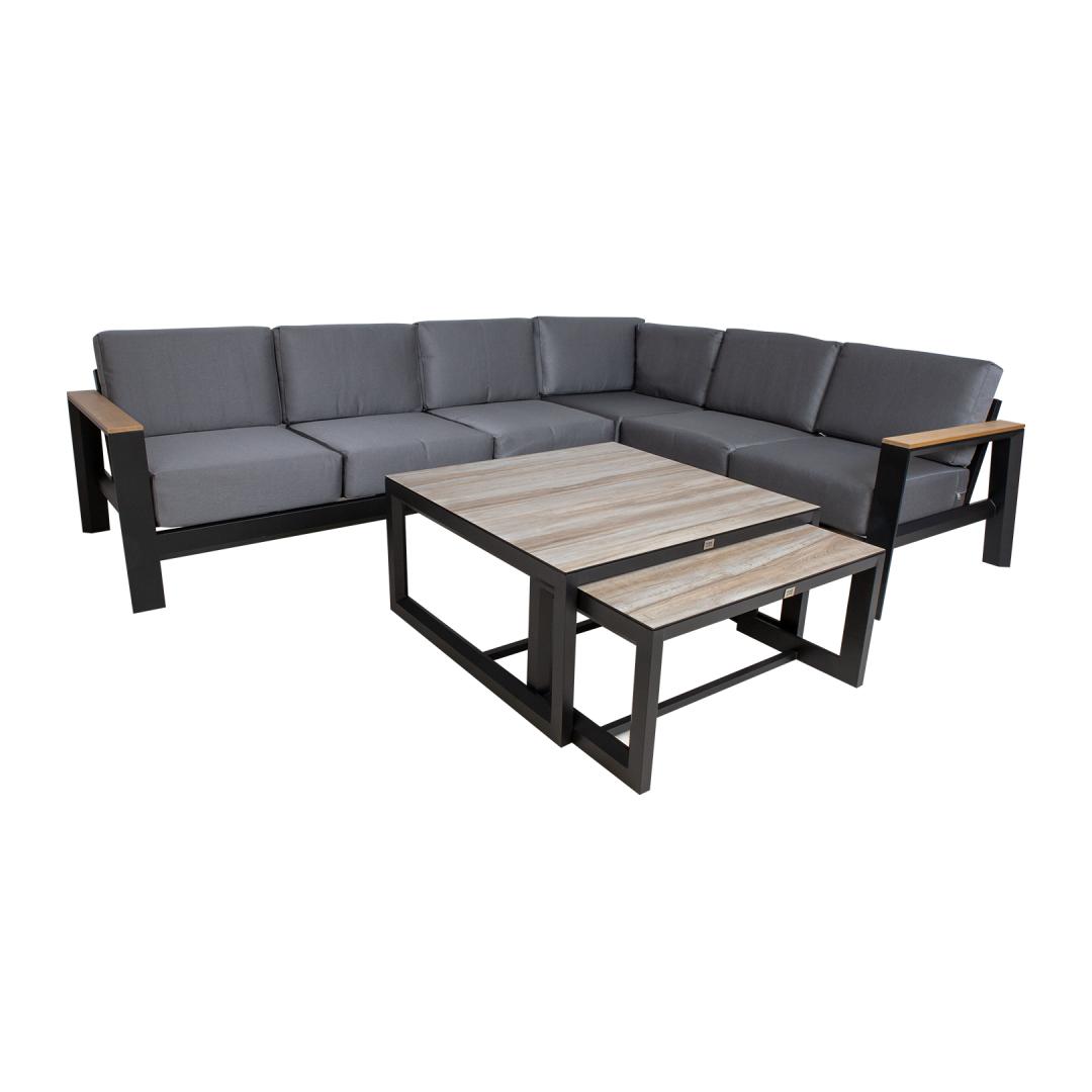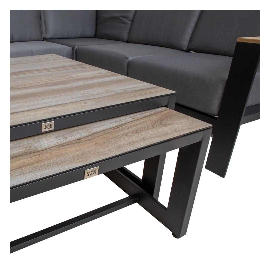 Aiamööblikomplekt FELINO nurgadiivan ja 2 lauda, must. FELINO komplekt on stiilne, mugav ja funktsionaalne ning sobib hästi ka suuremale seltskonnale. Komplekti kuulub 2 lauda, mida võib paigutada vastavalt vajadusele üksteise alla või eraldi. Mõlemal laual on pilkupüüdev, puitu imiteeriv karastatud klaasist plaat (paksus 5mm). Neljast osast koosneva nurgadiivani moodulid võib samuti paigutada vastavalt soovile. Paksud hallid padjad tagavad suurepärase istumismugavuse. Padjakatted on valmistatud väga hea ilmastikukindlusega olefin kangast. Komplekti kuulub 6 istmepatja 65x65x18cm, 5+1+1 seljatoepatja 64x38x10cm, 74/64x38x10cm, 60/50x38x10cm. Kõigi komplekti osade tugev põhikonstruktsioon on valmistatud alumiiniumist ja viimistletud musta pulbervärviga. Diivani käetugedel tiikpuu värvi kunstpuidust liistud. Laudade mõõdud 95x95xH47,5cm, 87x45xH42,5cm. Diivani moodulite mõõdud: kahekohalised parema/vasaku käetoega moodulid 140x96xH69,5cm, nurgamoodul 80,5x80,5xH69,5cm, ilma käetugedeta 1-kohaline moodul 65x80,5xH69,5cm. Toode on muutlikes ilmastikutingimustes väga hästi vastupidav ja lihtsalt hooldatav. Kaitset ilmastikuolude eest vajavad ainult padjad. Hea lahendus patjade igapäevaseks hoiustamiseks ja kuivana hoidmiseks on padjakast. Välitingimustes kasutatava mööbli eluea pikendamiseks soovitame kasutada välimööbli katteid. HOIUSTAMINE: suvehooaja lõppedes soovitame aiamööblit hoiustada siseruumides. Puhastage ja kuivatage mööbel enne hoiule panekut. Kasutage hoiustamiseks kuiva ning hea ventilatsiooniga ruumi.