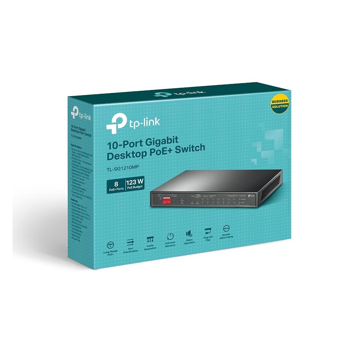 1xSFP|9x10/100/1000M|PoE+ ports 8|Switching capacity 20 Gbps|Forwarding rate 14.88 Mpps|Included Accessories TL-SG1210MP; Power adapter; Installation guide|Dimensions 209 × 126 × 26 mm|Unit Net Weight 1.4 kg