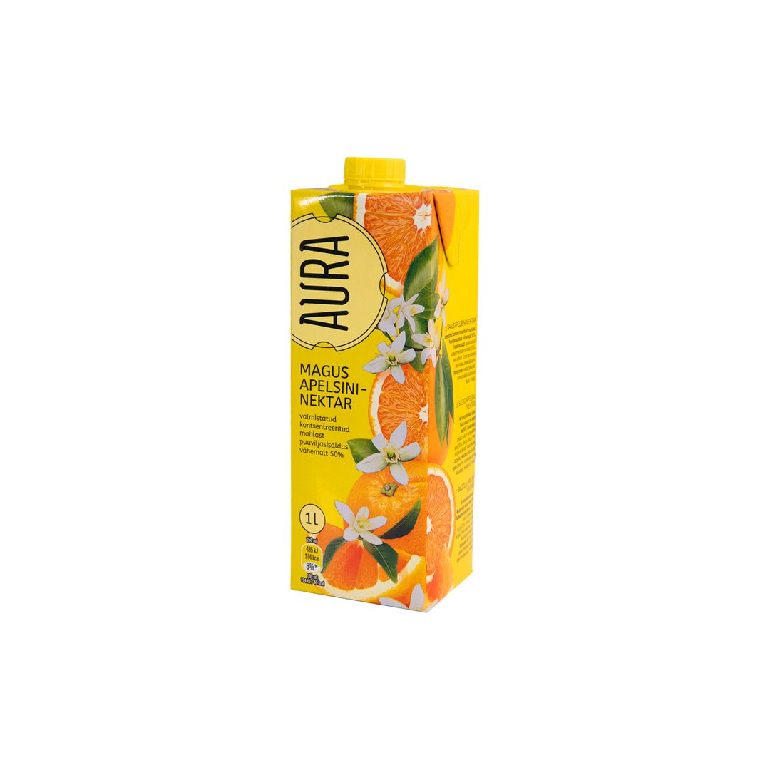Нектар сладкого апельсина Aura, приготовленный из концентрированного сока. Содержание сока не менее 50%. Спелые сладкие апельсины придают напитку более мягкий вкус, чем обычно. Не содержит консервантов.