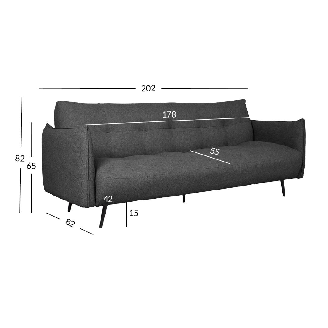 Diivani üldmõõdud on 202x82xH82cm. Istme laius 178cm, istme sügavus 55cm, istme kõrgus 42cm. Käetoe kõrgus maast 65cm.