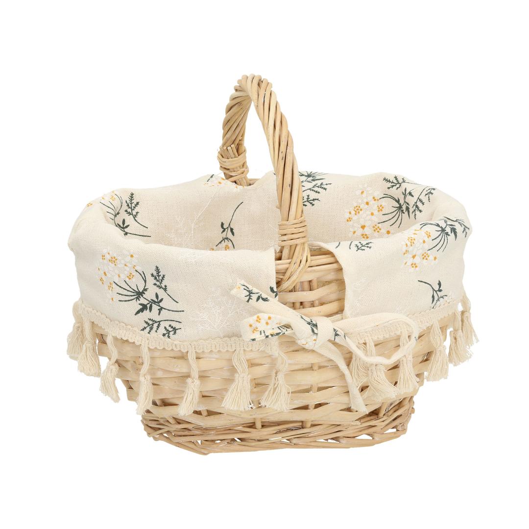 Tekstiilvooder: puuvillane lilleline kangas. Korvi materjal: käsitsi punutud naturaalne pajuvits.