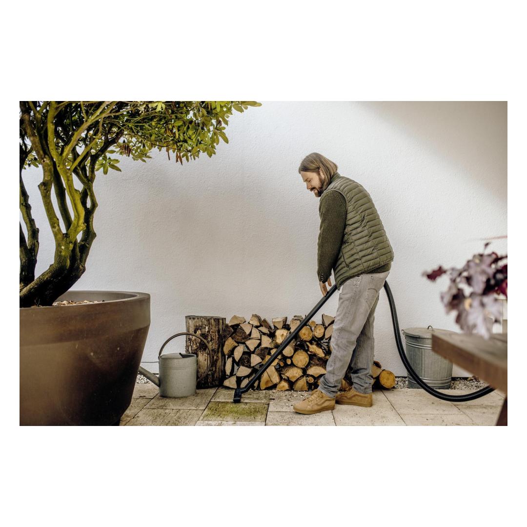 The WD 3 S V-17/4/20 + 4 FB wet and dry vacuum cleaner with rated input power of only 1,000 watts comes with four extra fleece filter bags in addition to the one fleece filter bag supplied ordinarily. The device also features a Clips floor nozzle, robust 17 litre stainless steel container, 4-metre cable, 2-metre suction hose, removable handle, cartridge filter and fleece filter bag, thus allowing optimal cleaning results to be achieved for dry, wet, fine or coarse dirt. The 1-piece cartridge filter enables convenient vacuuming of dry and wet dirt, without having to change the filter. Other features: removable handle for added convenience when vacuuming in confined spaces, space-saving and secure storage of suction hose, practical blower function, storage area on device head for tool and small parts, cable hook, ergonomic carrying handle, rotary switch for switching the device on and off with ease, and Pull & Push locking system for simplifying the opening and closing of the container. The handle of the vacuum cleaner can be removed and the accessories can be attached directly to the suction hose. Another clever feature is the surface on top of the device for storing small parts.