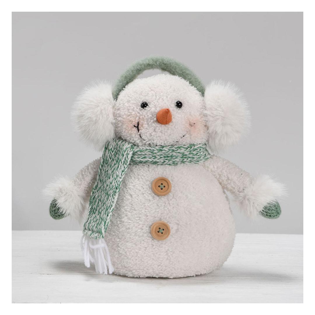 Mõõdud: 20x12xH26cm Dekoratsioon FUN EKE, lumememm helerohelise salliga.