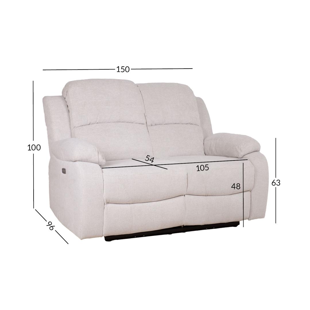 Diivani üldmõõdud on 150x96xH100cm. Istme laius 105cm, istme sügavus 54cm, istme kõrgus 48cm. Käetoe kõrgus maast 63cm. Diivan FELICIA 2-kohaline elektriline recliner, loodusvalge.