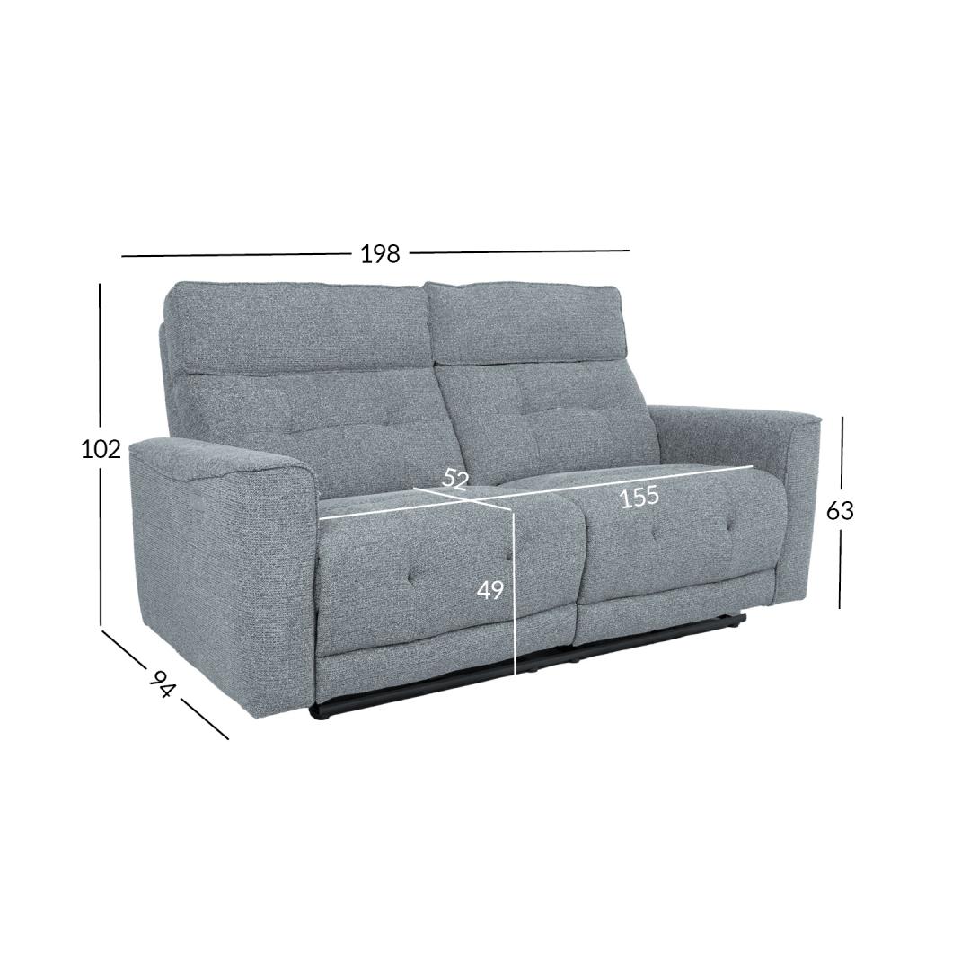 Diivani üldmõõdud on 198x94xH102cm. Istme laius 155cm, istme sügavus 52cm, istme kõrgus 49cm. Käetoe kõrgus maast 63cm. Diivan BOSCO 2,5-kohaline elektriline recliner, sinakashall.