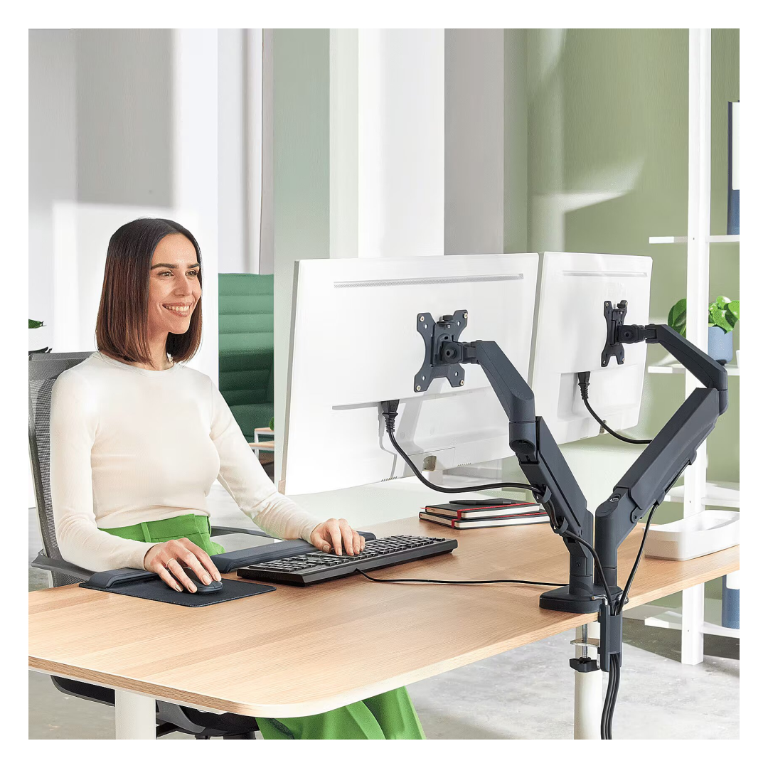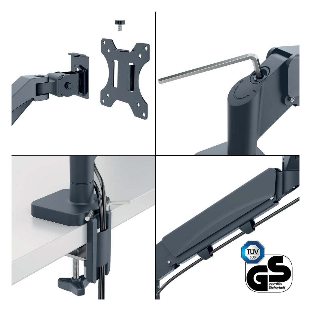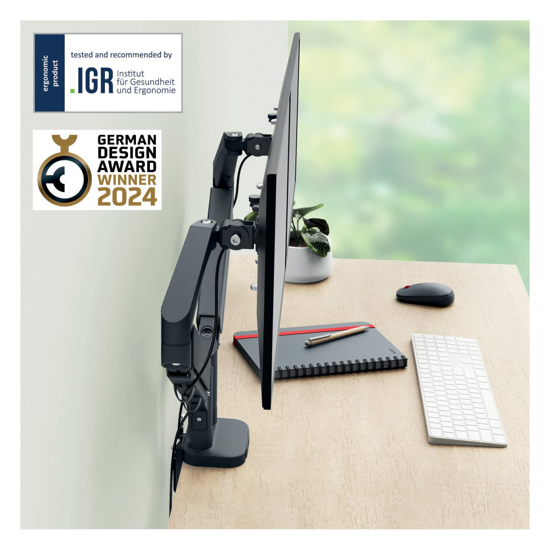 Эргономичный кронштейн для одного монитора, сертифицированный TÜV и IGR, улучшает осанку, положение глаз и комфорт шеи и плеч при правильной регулировке высоты монитора. Компактная конструкция позволя
