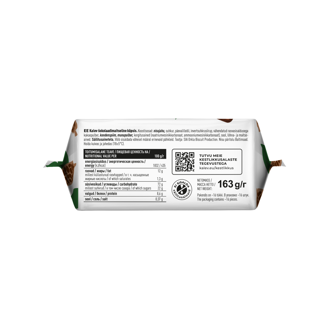 Печенье, которое уже много лет стоит на столе и в сердцах эстонцев. Приготовленное по классическому рецепту Калева, это шоколадное печенье идеально подходит для выпечки или приготовления десертов, а также для наслаждения кофе или чаем.