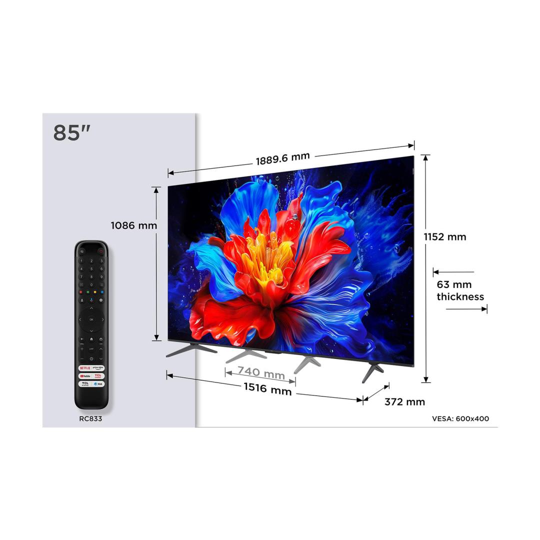 TCL P89K 85P89K. Display diagonal: 2.16 m (85"), Display resolution: 3840 x 2160 pixels, HD type: 4K Ultra HD, Display technology: QLED, Screen shape: Flat. Smart TV. Motion interpolation technology: PPI (Picture Performance Index) 3700, Display brightness: 450 cd/m², Native aspect ratio: 16:9. Digital signal format system: DVB-C, DVB-S2, DVB-T2. Wi-Fi, Ethernet LAN. Product colour: Metallic