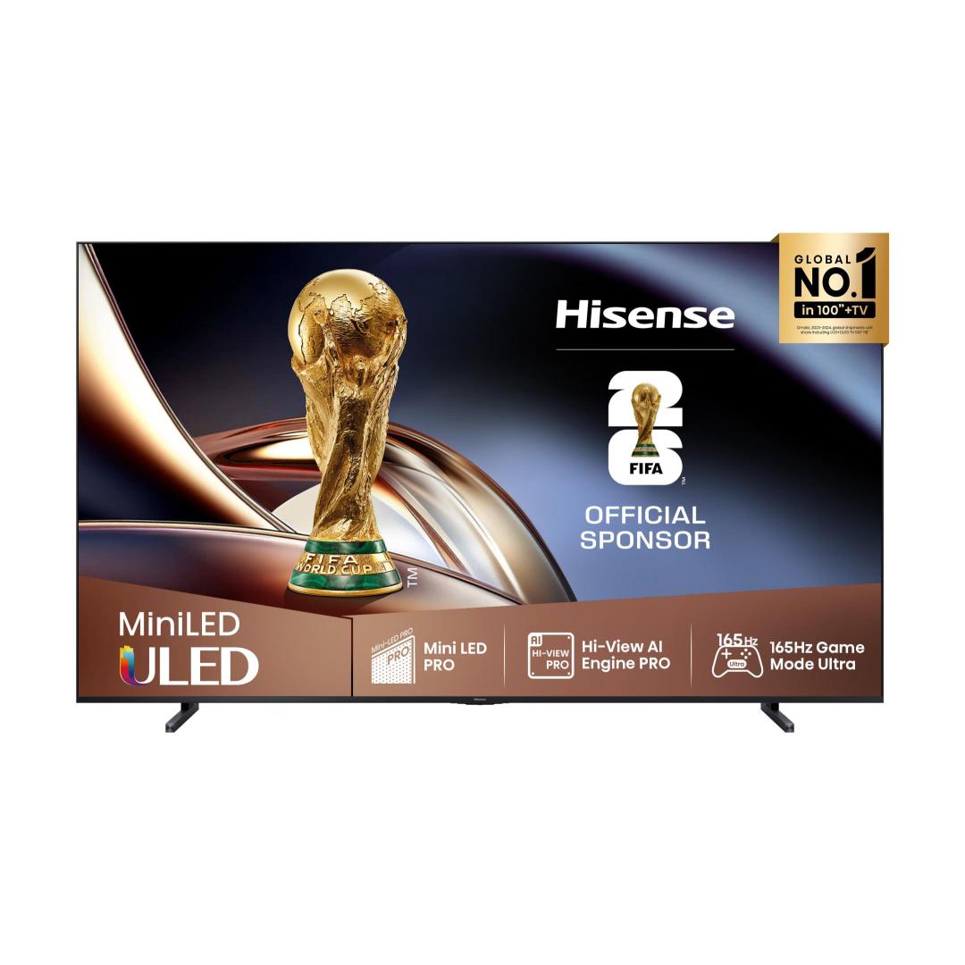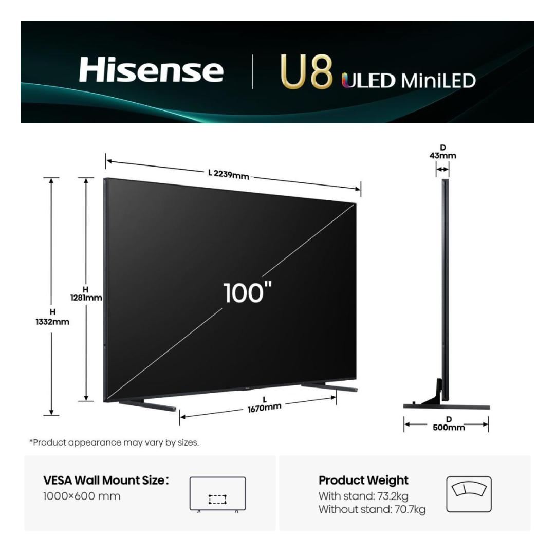 Hisense 100U8Q. Display diagonal: 2.54 m (100"), Display resolution: 3840 x 2160 pixels, HD type: 4K Ultra HD, Display technology: ULED, Screen shape: Flat, LED backlighting type: Mini LED. Smart TV. Response time: 6 ms, Contrast ratio (typical): 5000:1, Native aspect ratio: 16:9. Digital signal format system: DVB-C, DVB-S, DVB-S2, DVB-T2. Wi-Fi, Ethernet LAN. Product colour: Black, Grey
