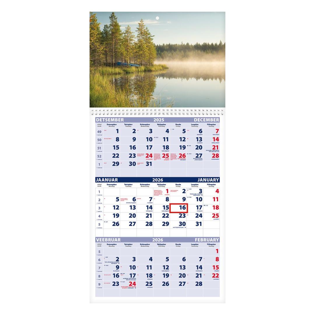 Настенный календарь с обзором трех месяцев. В открытом виде с изображением 297х630мм. Красный статический маркер даты. Календарь включает национальные праздники, национальные и национальные календарные годовщины, дни флага, 42 национальных праздника в виде сокращений, время восхода и захода солнца, фазы луны, начало времен года. Названия дней и месяцев на эстонском и английском языках. В правой части страницы есть поля для обозначения дней рождения или событий. При заказе со своим изображением и/или рекламной полосой цена меняется.