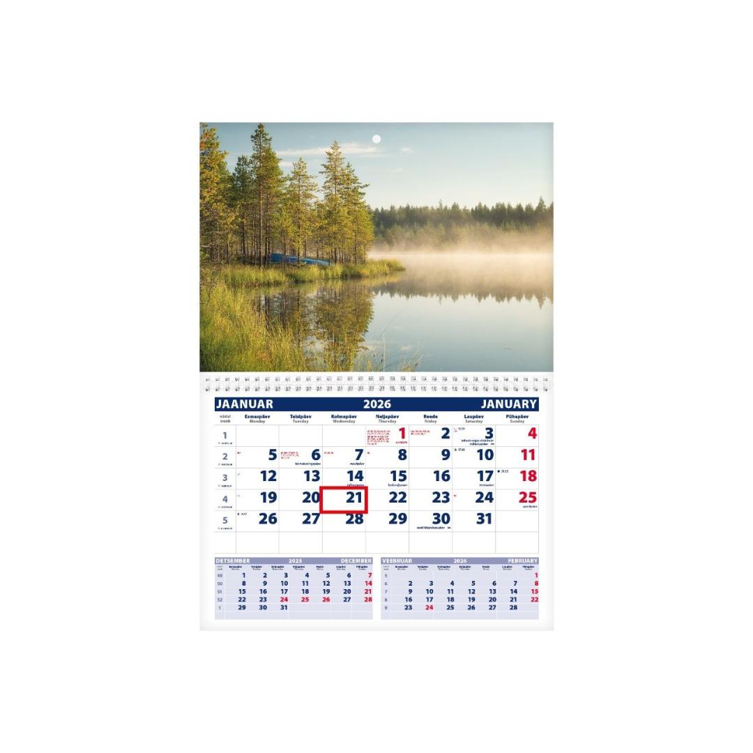 Настенный календарь с видом на Луну. В открытом виде с изображением 297х425мм. Красный статический маркер даты. Календарь включает национальные праздники, национальные и национальные календарные годовщины, дни флага, 42 национальных праздника в виде сокращений, время восхода и захода солнца, фазы луны, начало времен года. Всегда открыт на предыдущий и следующий месяц. Названия дней и месяцев на эстонском и английском языках. При заказе со своим изображением и/или рекламной полосой цена меняется.