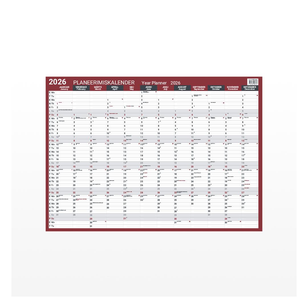 Календарь планирования Размер: 700×500 мм Язык: EE, EN национальные праздники, государственные календарные праздники, дни флага, восход и заход солнца, фазы луны. Двухцветный настольный календарь.