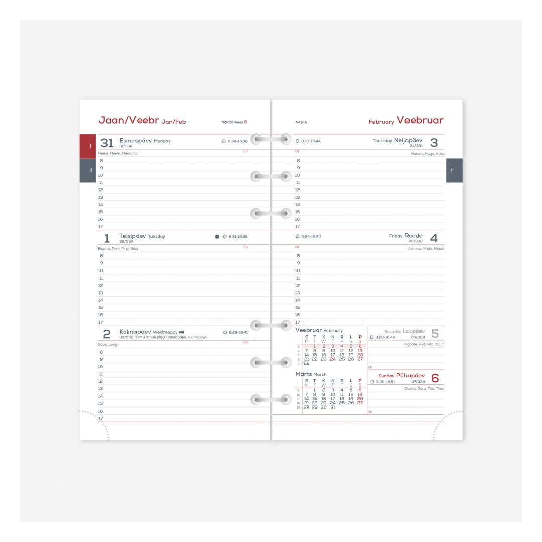 Размер содержимого: 95 x 168 мм Язык: эстонский и английский Перфорированные открытые страницы (6 отверстий) Перфорированные углы страниц Подходит для следующих обложек: MIDI Timex