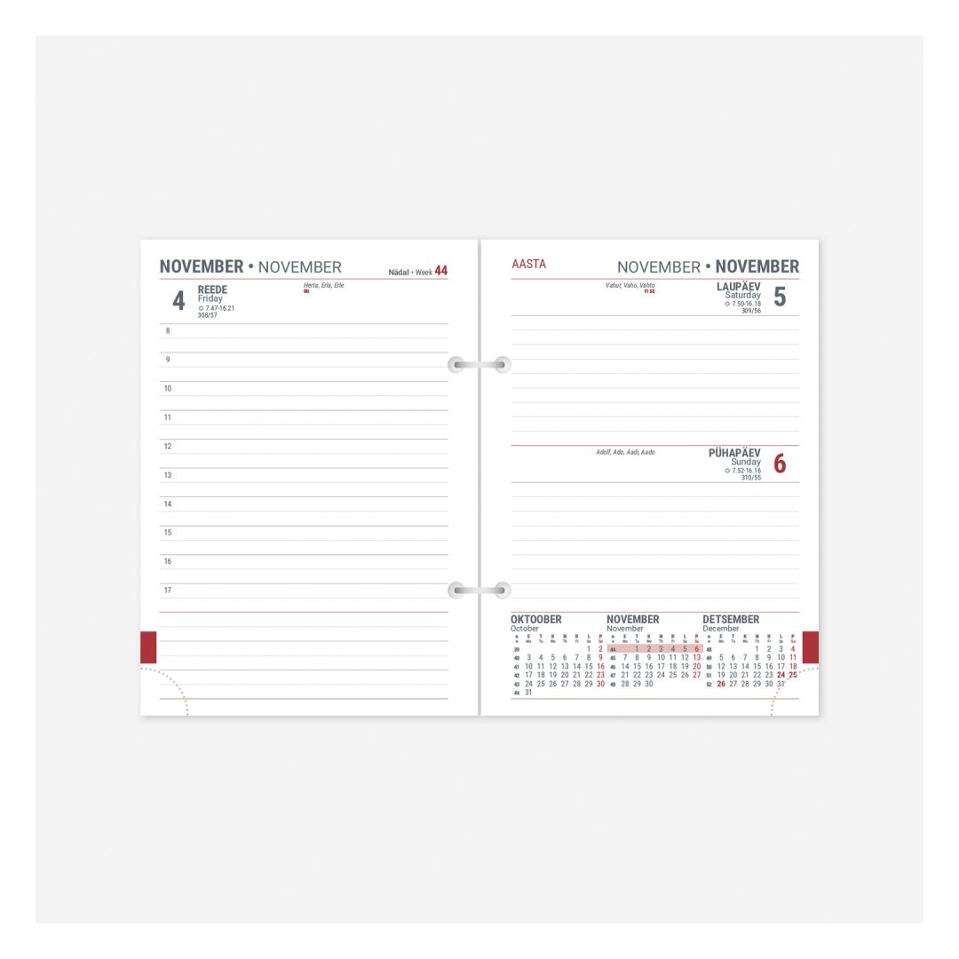 Размер содержимого: 105 x 148 мм (A6) Расстояние между отверстиями: 70 мм Перфорированные углы страниц Язык: эстонский и английский Все календари DESKTOP включают следующее: государственные праздники, национальные годовщины, дни флага и именины, пропущенные четверги, переход на летнее и зимнее время, национальные праздники 37 стран с сокращениями, время восхода и захода солнца (Таллинн), фазы луны с указанием времени, знаки зодиака, список дней, мини-календарь, номер недели, начало сезонов с указанием времени. Дополнительные страницы включают табличный календарь, годовой план, планировщик праздников, контакты, заметки, мировое время, преобразование единиц, легенду календаря.