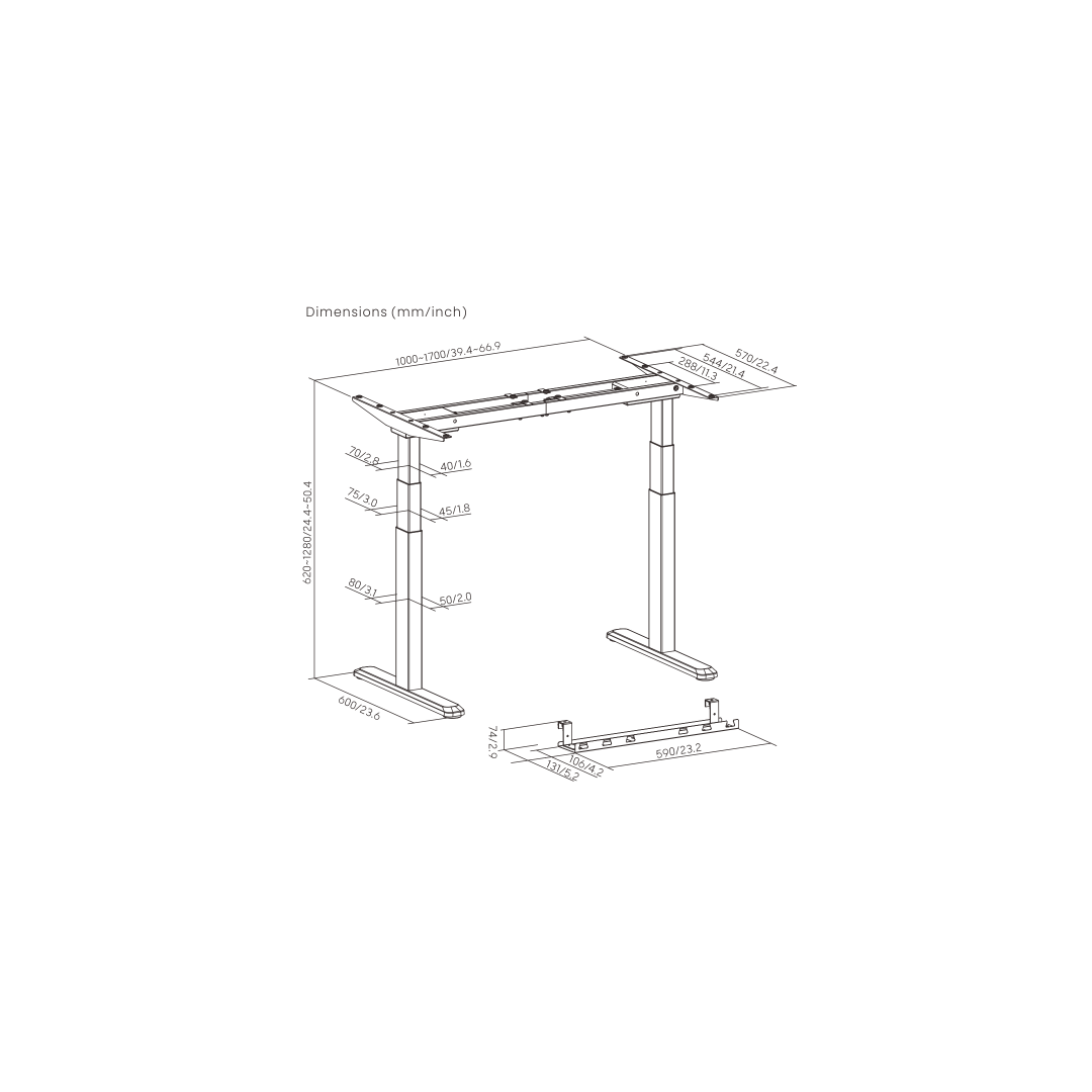 1000~1700x600x620~1280mm (39.4"~66.9"x23.6"x24.4"~50.4")