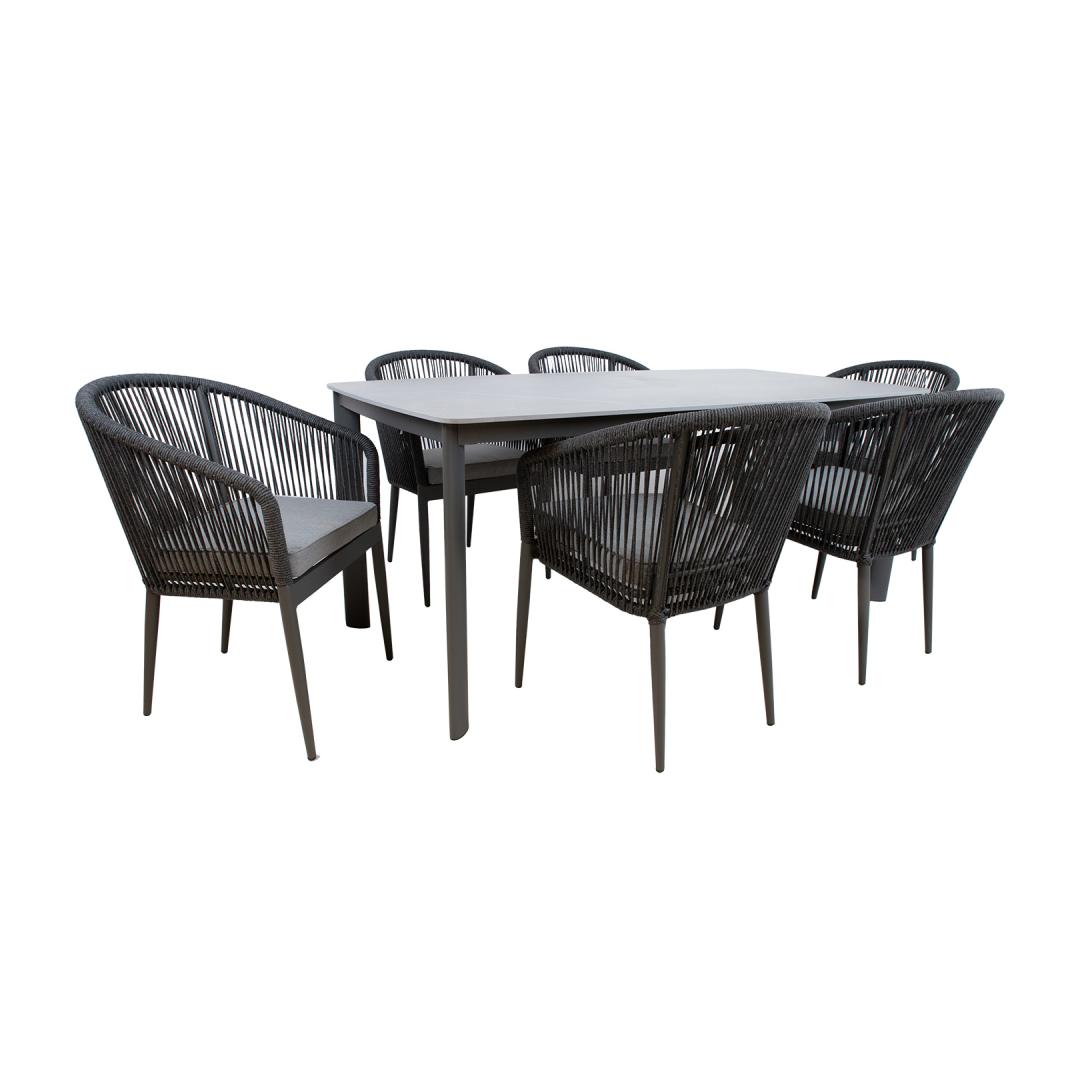Aiamööblikomplekt BEIDA laud ja 6 tooli. Laua mõõdud on 180x90xH75cm. Lauaplaat: 11mm paagutatud kivi. Paagutatud kivist (sintered stone) lauaplaadi valmistamisel on kasutatud innovatiivset tehnoloogiat, mis jäljendab loodusliku kivi moodustumise protsessi sügaval maakoores. Kaoliini ehk portselansavi osakesed töödeldakse 1200 kraadises kuumuses, mille tulemusena moodustub materjal, mis oma omadustel ja välimuselt sarnaneb naturaalse kiviga. Lauaplaat on küll õhuke, kuid väga tugev (suhteline kõvadus Mohsi skaalal 7), kulumiskindel, talub hästi kõrget temperatuuri ja erinevaid ilmastikutingimusi, ei ima plekke ja seda on väga lihtne puhastada ja hooldada. Kuna keemilisi sideaineid ei ole kasutatud on materjal hügieeniline. TÄHELEPANU! Vältige lööke, põrutusi ja kukkumist. Laua ja toolide jalad ja raam on valmistatud alumiiniumist ja viimistletud halli pulbervärviga. Tooli selja- ja käetoed on kaetud nöörpunutisega. Istmepadi kuulub komplekti. Padjakate on valmistatud polüesterkangast. Padja mõõdud 45x42x5cm. Istmepõhi on toestatud alumiiniumliistudega. Tooli mõõdud on 57x65xH81cm, istmekõrgus 44cm. Kaalupiirang 100kg. Toolid on virnastatavad ning nende hoiustamine on lihtne ja ruumi säästev. Toode on muutlikes ilmastikutingimustes vastupidav ja lihtsalt hooldatav. Välitingimustes kasutatava mööbli eluea pikendamiseks soovitame kasutada välimööbli katteid. HOIUSTAMINE: suvehooaja lõppedes soovitame aiamööblit hoiustada siseruumides. Puhastage ja kuivatage mööbel enne hoiule panekut. Kasutage hoiustamiseks kuiva ning hea ventilatsiooniga ruumi. Aiamööblikomplekt BEIDA laud ja 6 tooli. Laua mõõdud on 180x90xH75cm. Lauaplaat: 11mm paagutatud kivi. Paagutatud kivist (sintered stone) lauaplaadi valmistamisel on kasutatud innovatiivset tehnoloogiat, mis jäljendab loodusliku kivi moodustumise protsessi sügaval maakoores. Kaoliini ehk portselansavi osakesed töödeldakse 1200 kraadises kuumuses, mille tulemusena moodustub materjal, mis oma omadustel ja välimuselt sarnaneb naturaalse kiviga. Lauaplaat on küll õhuke, kuid väga tugev (suhteline kõvadus Mohsi skaalal 7), kulumiskindel, talub hästi kõrget temperatuuri ja erinevaid ilmastikutingimusi, ei ima plekke ja seda on väga lihtne puhastada ja hooldada. Kuna keemilisi sideaineid ei ole kasutatud on materjal hügieeniline. TÄHELEPANU! Vältige lööke, põrutusi ja kukkumist. Laua ja toolide jalad ja raam on valmistatud alumiiniumist ja viimistletud halli pulbervärviga. Tooli selja- ja käetoed on kaetud nöörpunutisega. Istmepadi kuulub komplekti. Padjakate on valmistatud polüesterkangast. Padja mõõdud 45x42x5cm. Istmepõhi on toestatud alumiiniumliistudega. Tooli mõõdud on 57x65xH81cm, istmekõrgus 44cm. Kaalupiirang 100kg. Toolid on virnastatavad ning nende hoiustamine on lihtne ja ruumi säästev. Toode on muutlikes ilmastikutingimustes vastupidav ja lihtsalt hooldatav. Välitingimustes kasutatava mööbli eluea pikendamiseks soovitame kasutada välimööbli katteid. HOIUSTAMINE: suvehooaja lõppedes soovitame aiamööblit hoiustada siseruumides. Puhastage ja kuivatage mööbel enne hoiule panekut. Kasutage hoiustamiseks kuiva ning hea ventilatsiooniga ruumi.