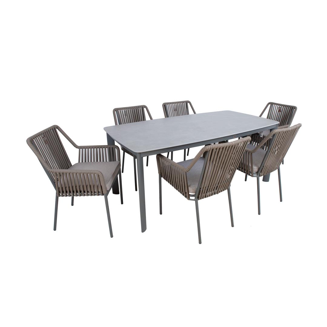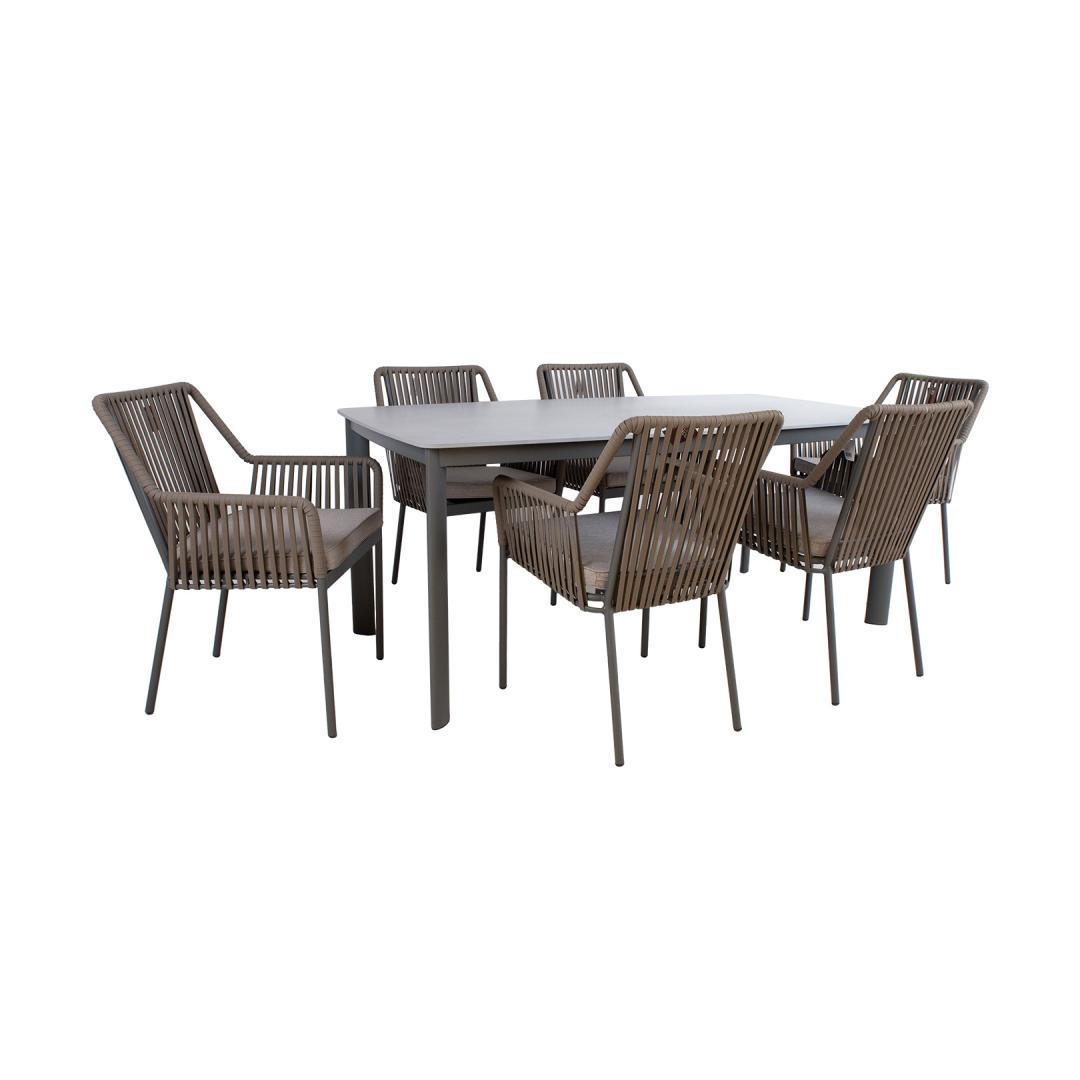 Aiamööblikomplekt BEIDA laud ja 6 tooli. Laua mõõdud on 180x90xH75cm. Lauaplaat: 11mm paagutatud kivi. Paagutatud kivist (sintered stone) lauaplaadi valmistamisel on kasutatud innovatiivset tehnoloogiat, mis jäljendab loodusliku kivi moodustumise protsessi sügaval maakoores. Kaoliini ehk portselansavi osakesed töödeldakse 1200 kraadises kuumuses, mille tulemusena moodustub materjal, mis oma omadustel ja välimuselt sarnaneb naturaalse kiviga. Lauaplaat on küll õhuke, kuid väga tugev (suhteline kõvadus Mohsi skaalal 7), kulumiskindel, talub hästi kõrget temperatuuri ja erinevaid ilmastikutingimusi, ei ima plekke ja seda on väga lihtne puhastada ja hooldada. Kuna keemilisi sideaineid ei ole kasutatud on materjal hügieeniline. TÄHELEPANU! Vältige lööke, põrutusi ja kukkumist. Laua ja toolide jalad ja raam on valmistatud alumiiniumist ja viimistletud halli pulbervärviga. Tooli selja- ja käetoed on kaetud textilene nöörist punutisega. Istmepadjad kuuluvad komplekti. Padjakatted on valmistatud polüesterkangast. Padja paksus 5cm. Istmepõhi on toestatud on alumiiniumliistudega. Tooli mõõdud on 56x57xH85cm, istmekõrgus 44cm. Kaalupiirang 100kg. Toolid on virnastatavad ning nende hoiustamine on lihtne ja ruumi säästev. Toode on muutlikes ilmastikutingimustes vastupidav ja lihtsalt hooldatav. Välitingimustes kasutatava mööbli eluea pikendamiseks soovitame kasutada välimööbli katteid. HOIUSTAMINE: suvehooaja lõppedes soovitame aiamööblit hoiustada siseruumides. Puhastage ja kuivatage mööbel enne hoiule panekut. Kasutage hoiustamiseks kuiva ning hea ventilatsiooniga ruumi. Aiamööblikomplekt BEIDA laud ja 6 tooli. Laua mõõdud on 180x90xH75cm. Lauaplaat: 11mm paagutatud kivi. Paagutatud kivist (sintered stone) lauaplaadi valmistamisel on kasutatud innovatiivset tehnoloogiat, mis jäljendab loodusliku kivi moodustumise protsessi sügaval maakoores. Kaoliini ehk portselansavi osakesed töödeldakse 1200 kraadises kuumuses, mille tulemusena moodustub materjal, mis oma omadustel ja välimuselt sarnaneb naturaalse kiviga. Lauaplaat on küll õhuke, kuid väga tugev (suhteline kõvadus Mohsi skaalal 7), kulumiskindel, talub hästi kõrget temperatuuri ja erinevaid ilmastikutingimusi, ei ima plekke ja seda on väga lihtne puhastada ja hooldada. Kuna keemilisi sideaineid ei ole kasutatud on materjal hügieeniline. TÄHELEPANU! Vältige lööke, põrutusi ja kukkumist. Laua ja toolide jalad ja raam on valmistatud alumiiniumist ja viimistletud halli pulbervärviga. Tooli selja- ja käetoed on kaetud textilene nöörist punutisega. Istmepadjad kuuluvad komplekti. Padjakatted on valmistatud polüesterkangast. Padja paksus 5cm. Istmepõhi on toestatud on alumiiniumliistudega. Tooli mõõdud on 56x57xH85cm, istmekõrgus 44cm. Kaalupiirang 100kg. Toolid on virnastatavad ning nende hoiustamine on lihtne ja ruumi säästev. Toode on muutlikes ilmastikutingimustes vastupidav ja lihtsalt hooldatav. Välitingimustes kasutatava mööbli eluea pikendamiseks soovitame kasutada välimööbli katteid. HOIUSTAMINE: suvehooaja lõppedes soovitame aiamööblit hoiustada siseruumides. Puhastage ja kuivatage mööbel enne hoiule panekut. Kasutage hoiustamiseks kuiva ning hea ventilatsiooniga ruumi.