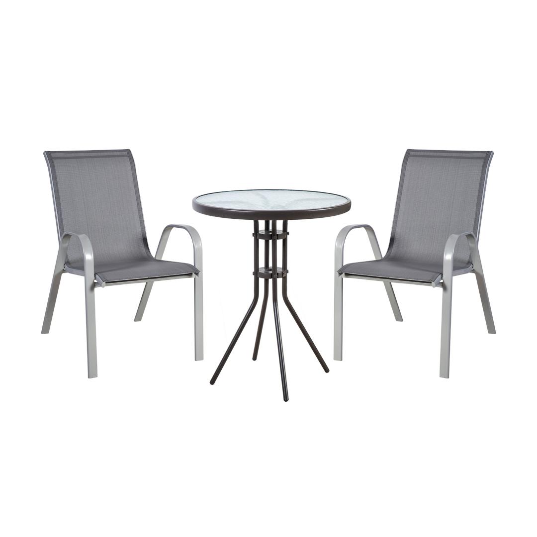 Aiamööblikomplekt DUBLIN laud ja 2 tooli, hall. Laua mõõdud on D60xH70cm. Lauaplaat: 5mm läbipaistev laineline klaas. Laua raam ja jalad on valmistatud terasest ja viimistletud tumepruuni pulbervärviga. Tooli textilene iste laseb hästi õhku läbi, kuivab kiiresti ja seda on lihtne puhastada. Tooli raam ja jalad on valmistatud terasest ja viimistletud halli pulbervärviga. Toolid on virnastatavad ning nende hoiustamine on lihtne ja ruumi säästev. Tooli üldmõõdud on 55,5x73xH90cm. Istme laius 45cm, istme sügavus 41cm, istme kõrgus 44cm. Seljatoe kõrgus 57cm. Käetoe kõrgus maast 61cm. Kaalupiirang 100kg.