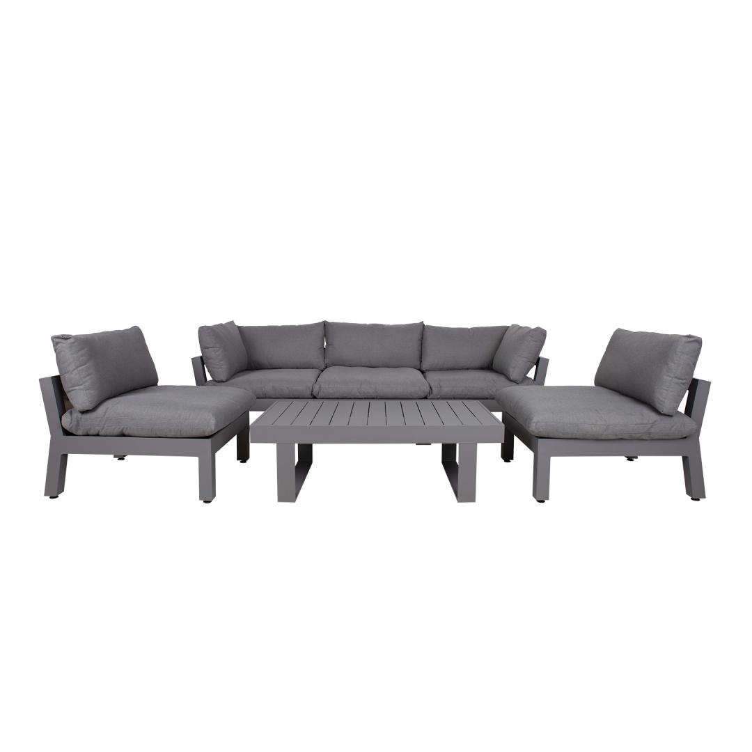 Aiamööblikomplekt FLUFFY mooduldiivan ja laud. Komplekti kuulub 2 nurgamoodulit, 3 vahemoodulit ja diivanilaud. Moodulite paigutust ja järjekorda on lihtne muuta. Diivani moodulite raamid ja laud on valmistatud alumiiniumist ja viimistletud halli pulbervärviga. Laua mõõdud on 133x73,5xH42cm. Nugamooduli mõõdud on 93x93xH66cm, vahemooduli mõõdud on 82x93xH66cm. Istmemoodulite põhjas on laiad põimitud rihmad, mida katab 3cm poroloonmatt. Paksud ja pehmed padjad ning elastne istmepõhi tagavad suurepärase istumismugavuse. Istme kõrgus raami ääreni on 35cm, koos padjaga 51cm. Istmepatjade mõõdud on 87x87xH16cm, seljatoepatjade mõõdud on 87x43x18cm, 72x43x16cm. Padjakatted on valmistatud hallist polüesterkangast. Padjakatted on eemaldatavad ja pestavad. Toode on muutlikes ilmastikutingimustes hästi vastupidav ja lihtsalt hooldatav. Kaitset ilmastikuolude eest vajavad ainult padjad. Hea lahendus patjade igapäevaseks hoiustamiseks ja kuivana hoidmiseks on padjakast. Välitingimustes kasutatava mööbli eluea pikendamiseks soovitame kasutada välimööbli katteid. HOIUSTAMINE: suvehooaja lõppedes soovitame aiamööblit hoiustada siseruumides. Puhastage ja kuivatage mööbel enne hoiule panekut. Kasutage hoiustamiseks kuiva ning hea ventilatsiooniga ruumi. Aiamööblikomplekt FLUFFY mooduldiivan ja laud. Komplekti kuulub 2 nurgamoodulit, 3 vahemoodulit ja diivanilaud. Moodulite paigutust ja järjekorda on lihtne muuta. Diivani moodulite raamid ja laud on valmistatud alumiiniumist ja viimistletud halli pulbervärviga. Laua mõõdud on 133x73,5xH42cm. Nugamooduli mõõdud on 93x93xH66cm, vahemooduli mõõdud on 82x93xH66cm. Istmemoodulite põhjas on laiad põimitud rihmad, mida katab 3cm poroloonmatt. Paksud ja pehmed padjad ning elastne istmepõhi tagavad suurepärase istumismugavuse. Istme kõrgus raami ääreni on 35cm, koos padjaga 51cm. Istmepatjade mõõdud on 87x87xH16cm, seljatoepatjade mõõdud on 87x43x18cm, 72x43x16cm. Padjakatted on valmistatud hallist polüesterkangast. Padjakatted on eemaldatavad ja pestavad. Toode on muutlikes ilmastikutingimustes hästi vastupidav ja lihtsalt hooldatav. Kaitset ilmastikuolude eest vajavad ainult padjad. Hea lahendus patjade igapäevaseks hoiustamiseks ja kuivana hoidmiseks on padjakast. Välitingimustes kasutatava mööbli eluea pikendamiseks soovitame kasutada välimööbli katteid. HOIUSTAMINE: suvehooaja lõppedes soovitame aiamööblit hoiustada siseruumides. Puhastage ja kuivatage mööbel enne hoiule panekut. Kasutage hoiustamiseks kuiva ning hea ventilatsiooniga ruumi.